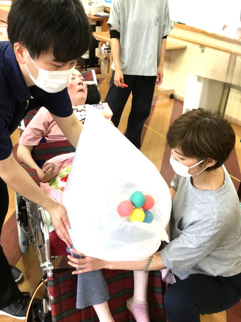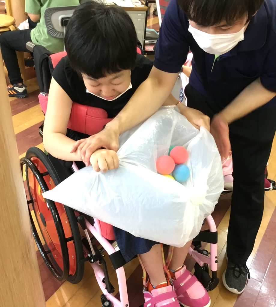 生活介護では毎月工夫をしながらレクリエーション活動をしております。7月は膨らませた袋の上にボールを乗せ、手で叩いたり、足で挟んだりして的の中に入れるゲームを行いました。その名も「袋でシュート」