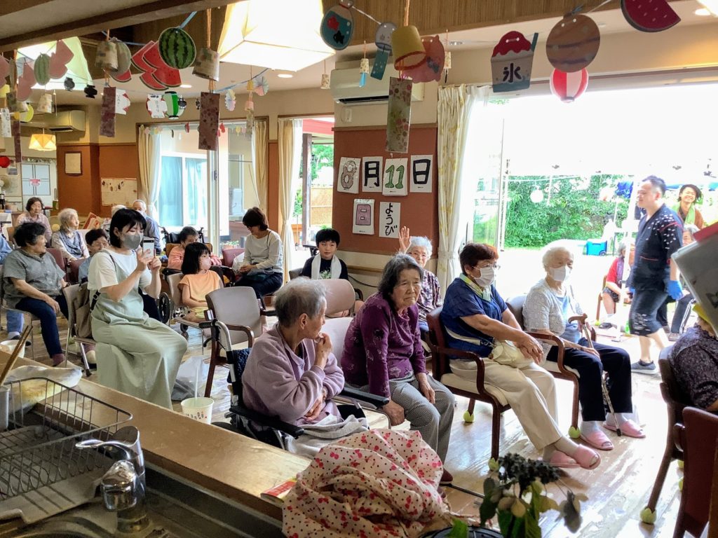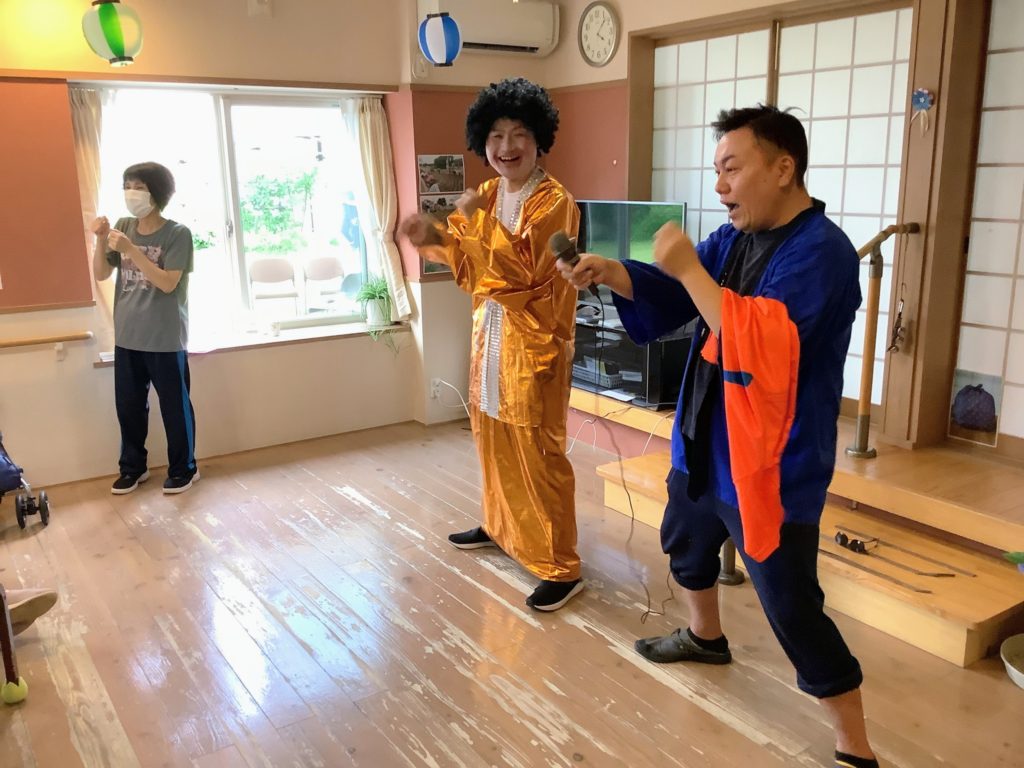 職員もパリオリンピックや夏祭りをテーマにした笑いヨガを行い、お客様と一緒に笑って元気になりました。