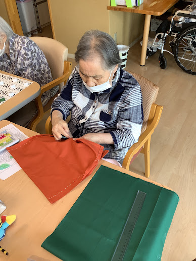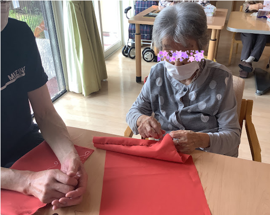 布の採寸は職員で行い、縫い付けはお客様にバトンタッチ!