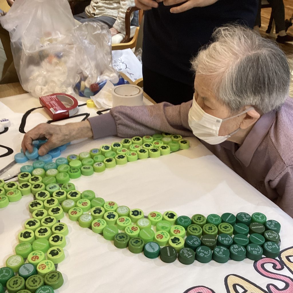 お客様と一緒に作った、ペットボトルキャップでの大きな一文字『笑』!