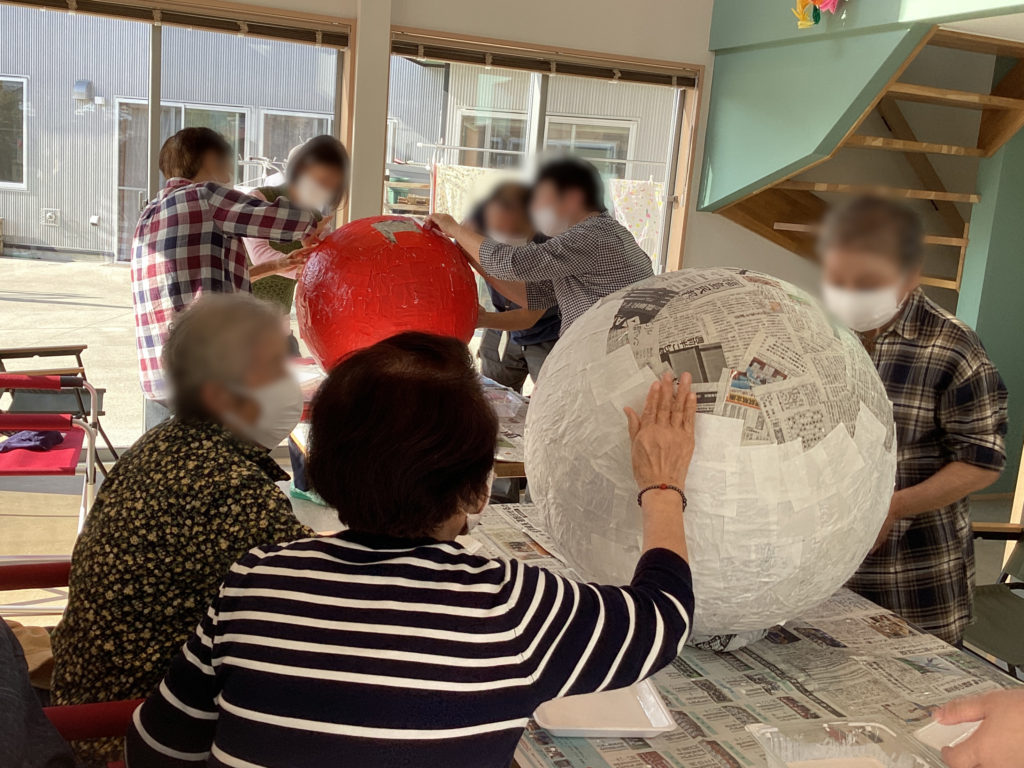 大きな風船に新聞紙を何枚も何枚も貼って完成しました!!