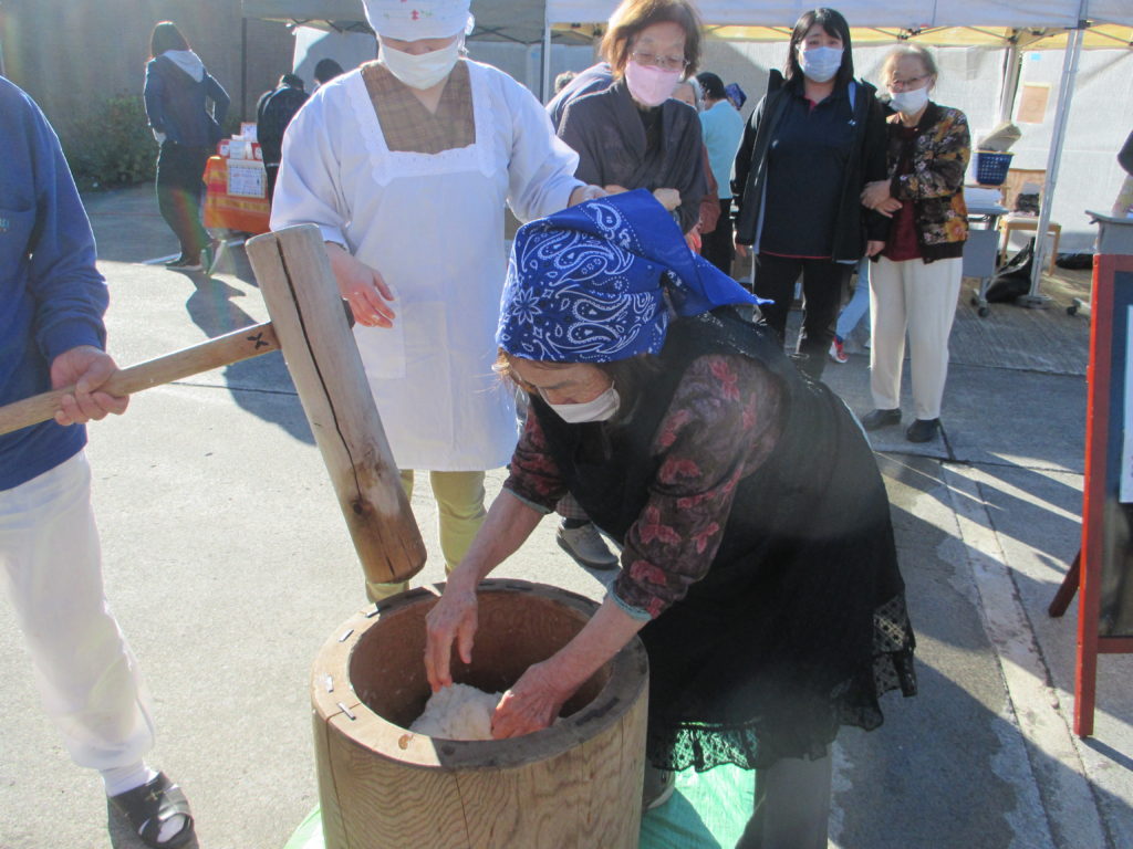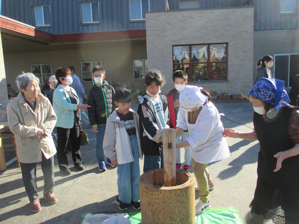 普段あまり体験できないもちつきを交代でぺったんぺったん!入居されているお客様に返しを手伝っていただきました。