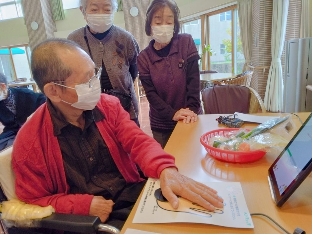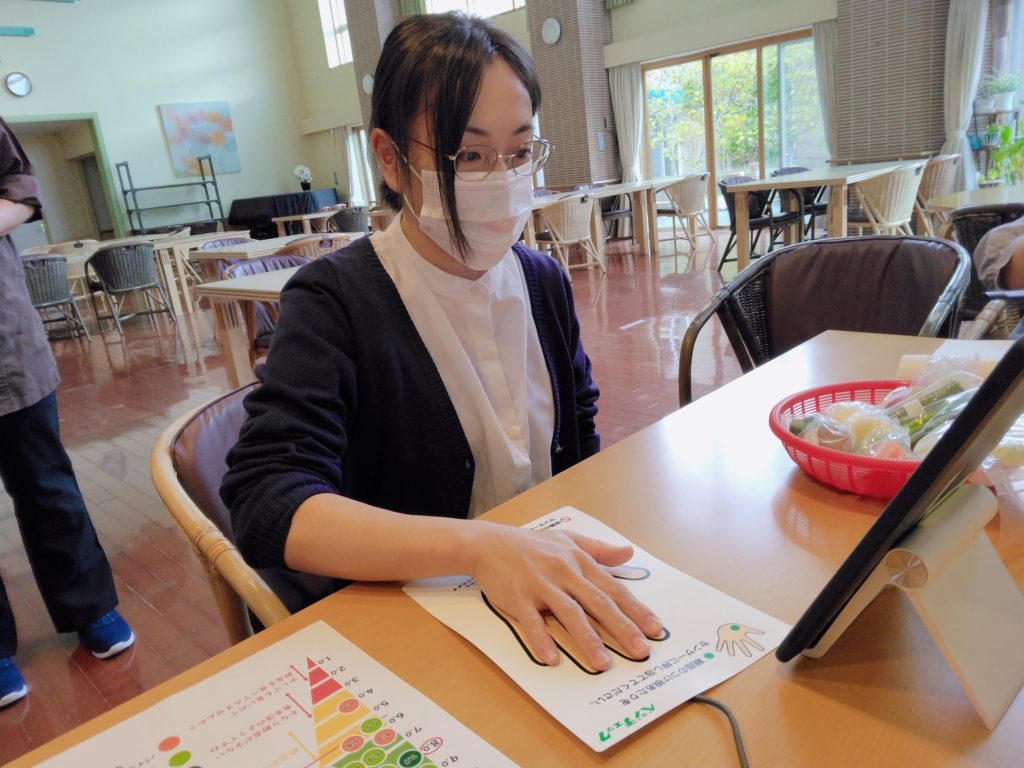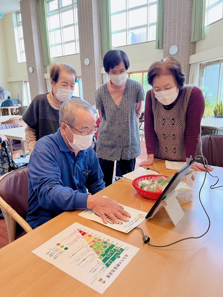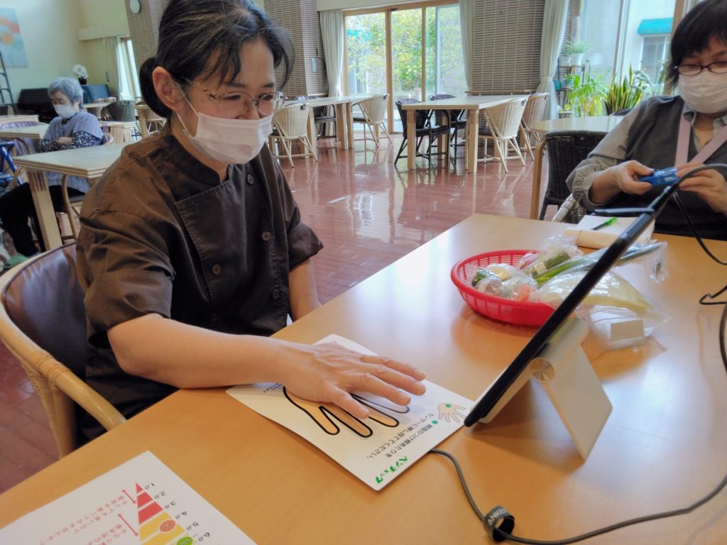 ケアハウス「ハーモニーあいづ」でベジチェック®を用いて、野菜の摂取量を視覚化する健康イベントを実施しました。