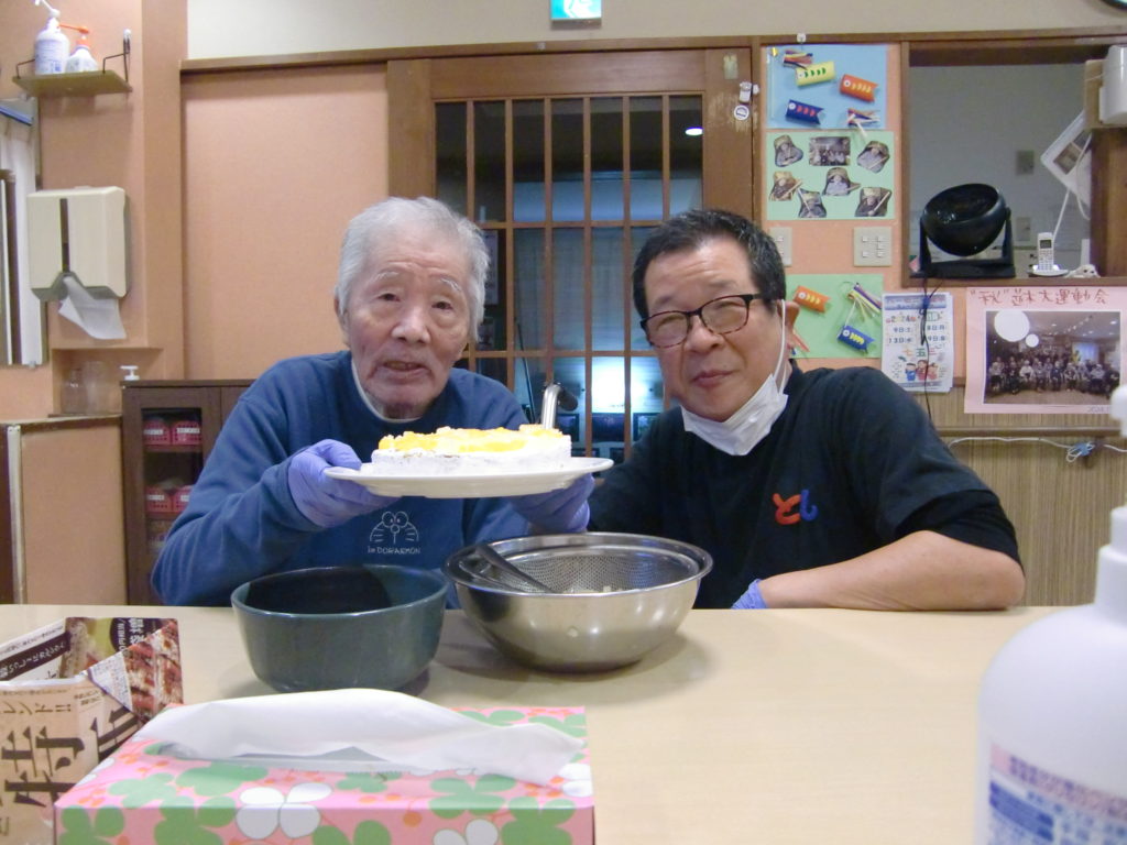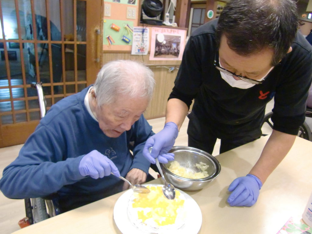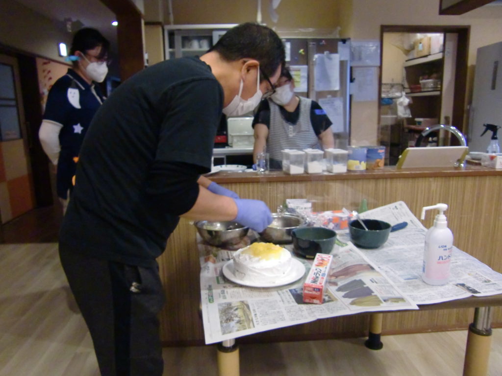 今日は12月の誕生日を迎える方をお祝いする為、皆さんでケーキ作りをしました。