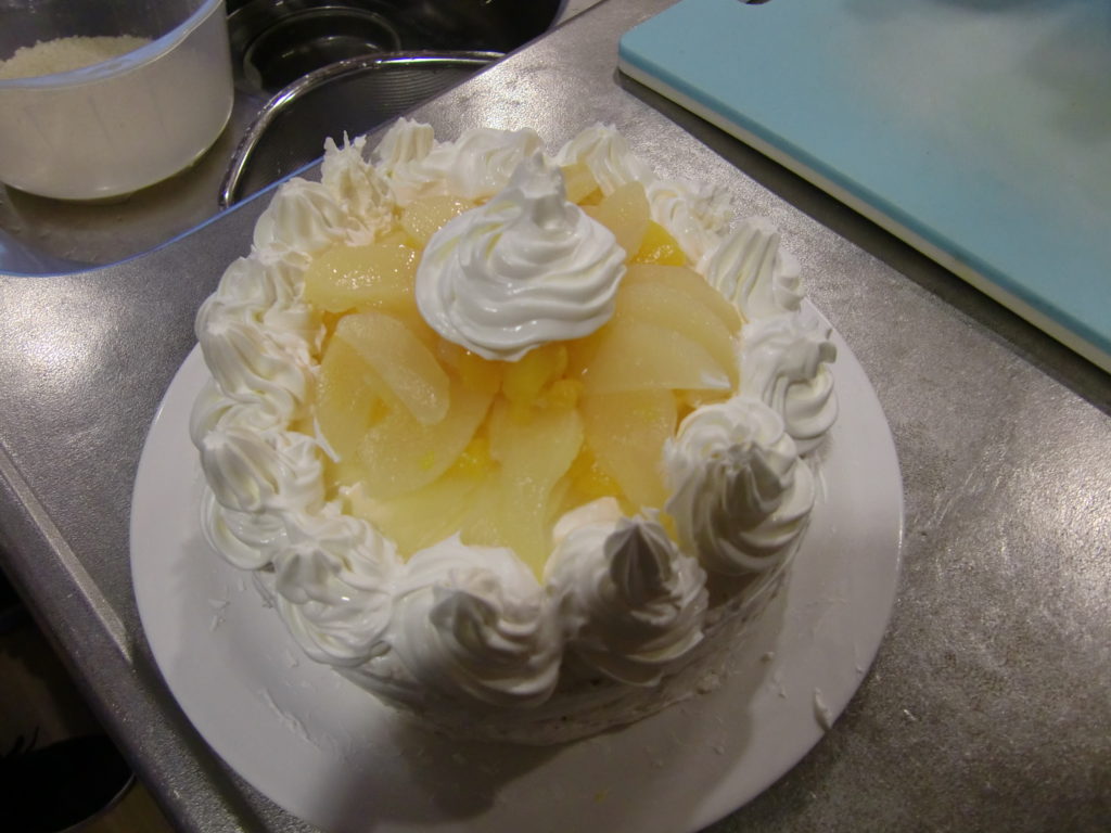 皆さんで生クリームを塗ったり、果物を飾りつけをしていきます。