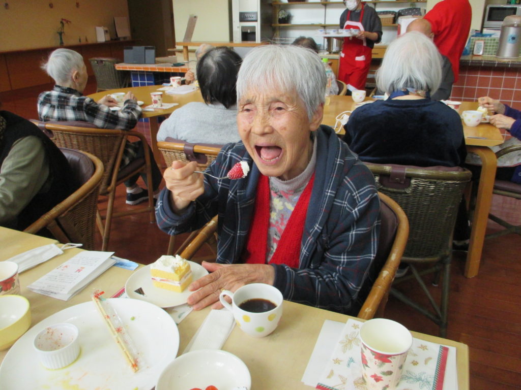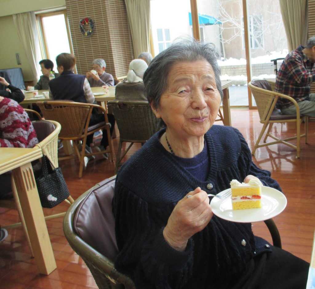 厨房の職員が腕によりをかけて作りました。ケーキの断面がキレイです。味も上品な甘さでお客様から好評でした。