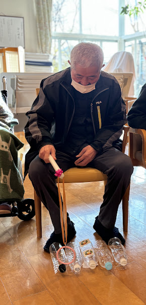 「よーいどん」の合図に合わせてペットボトルを、紐のついた棒で立たせます😊