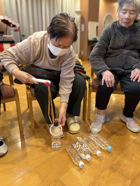 「よーいどん」の合図に合わせてペットボトルを、紐のついた棒で立たせます😊