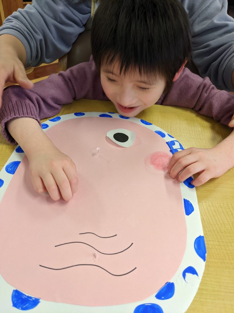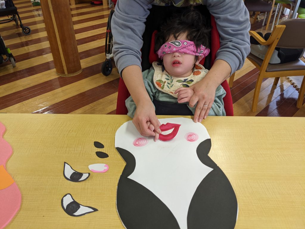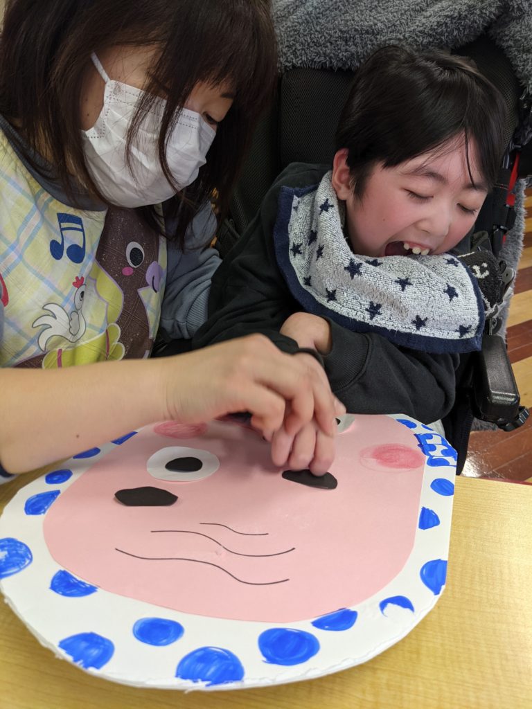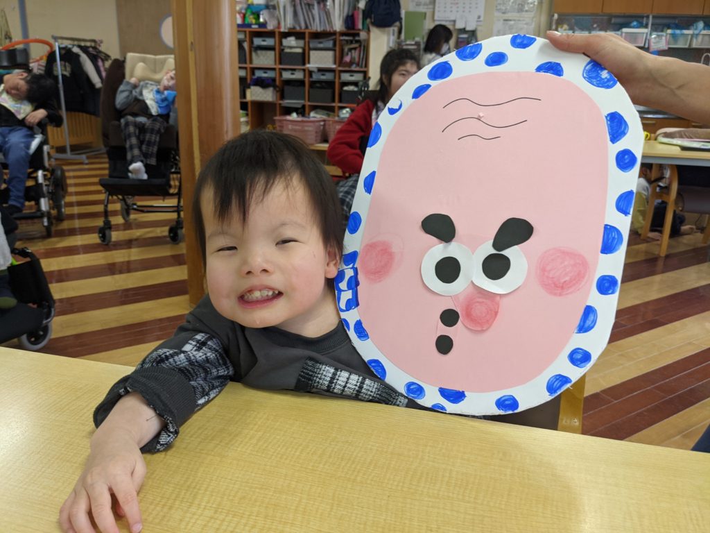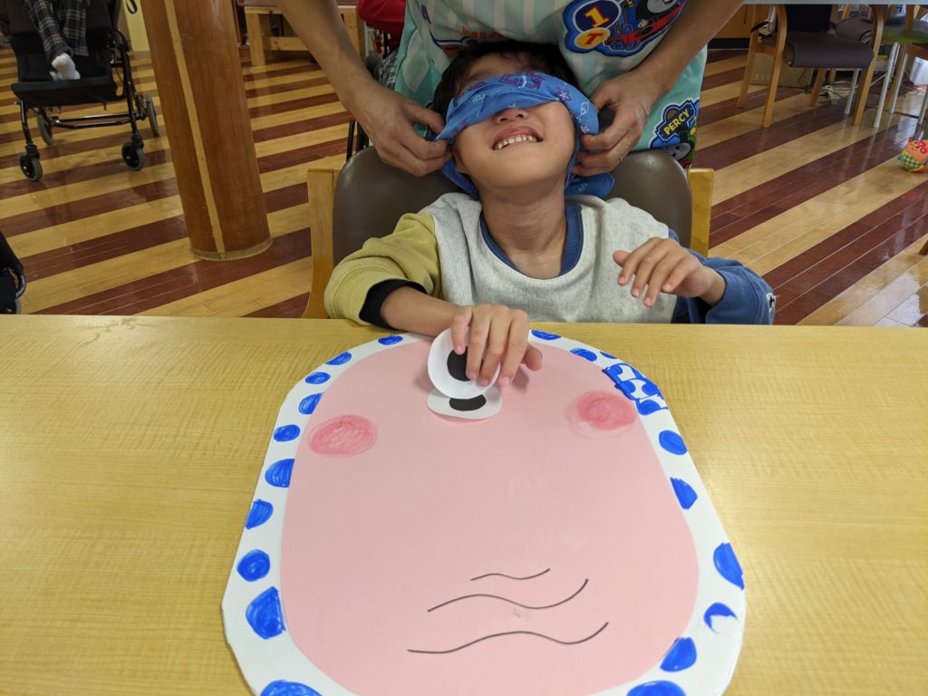 みんなで完成させた大きな福笑い。できあがった顔に大笑い☺