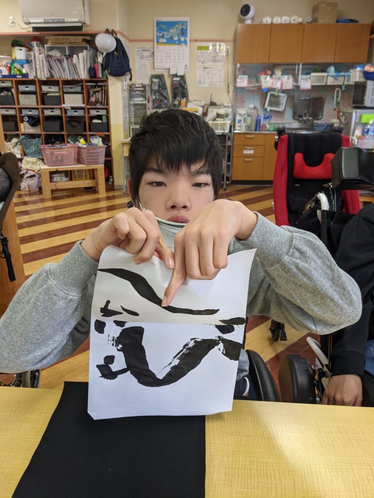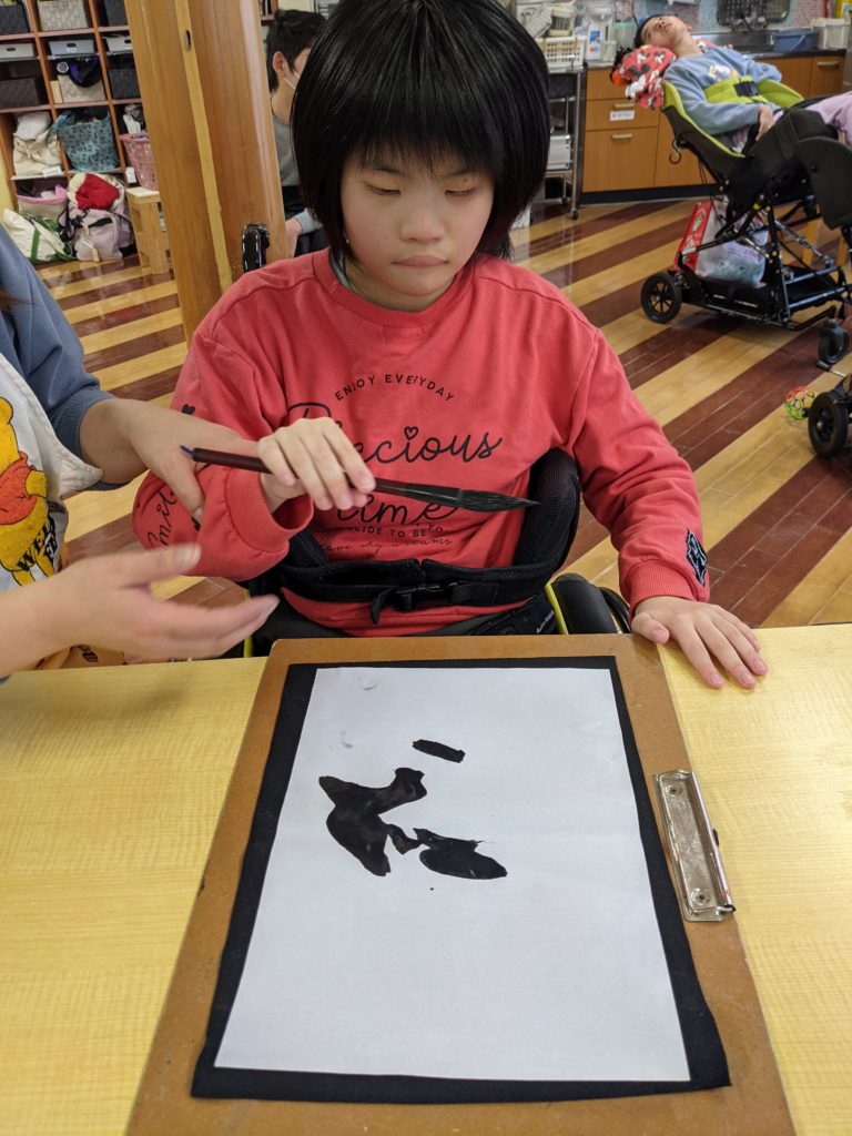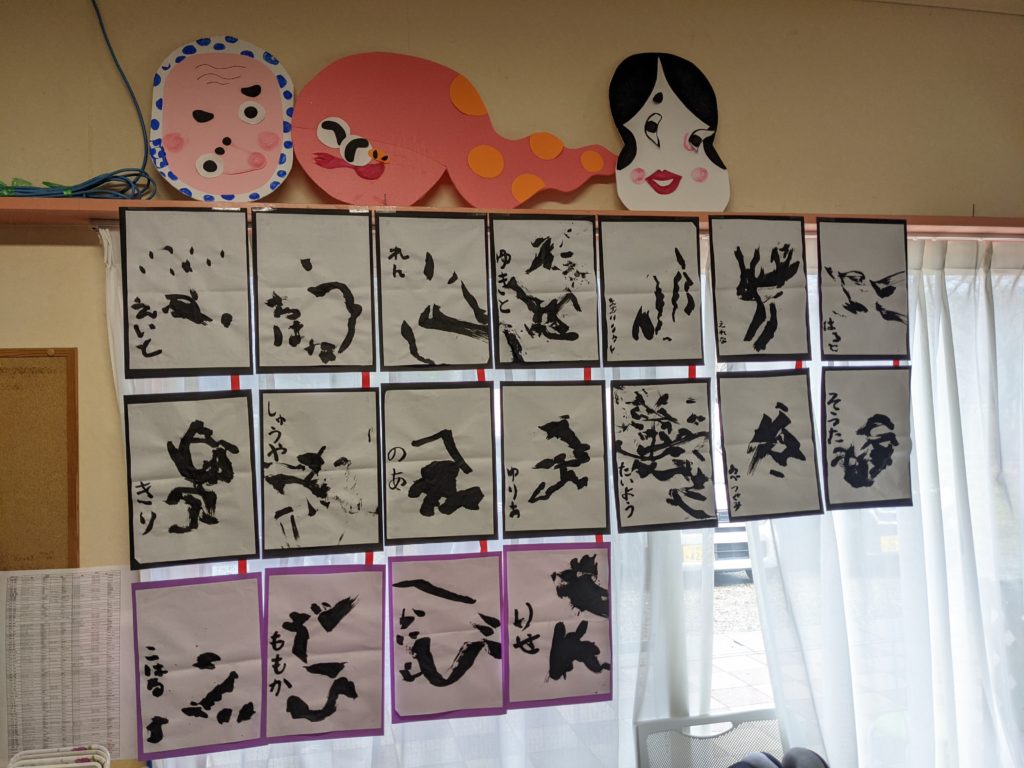 書初めでは、みんな味のあるすてきな作品を仕上げました。飾ってみるとまた迫力がありますね。