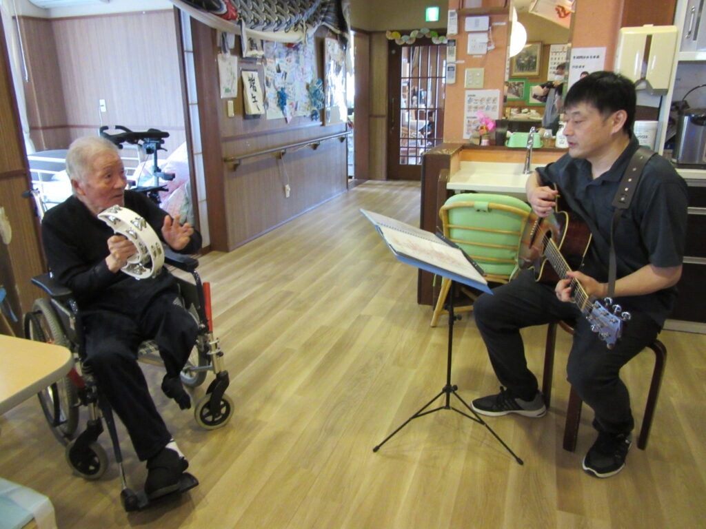 最近の皆様のお気に入りのレクリエーションは、職員が奏でるギターに合わせて歌う事。