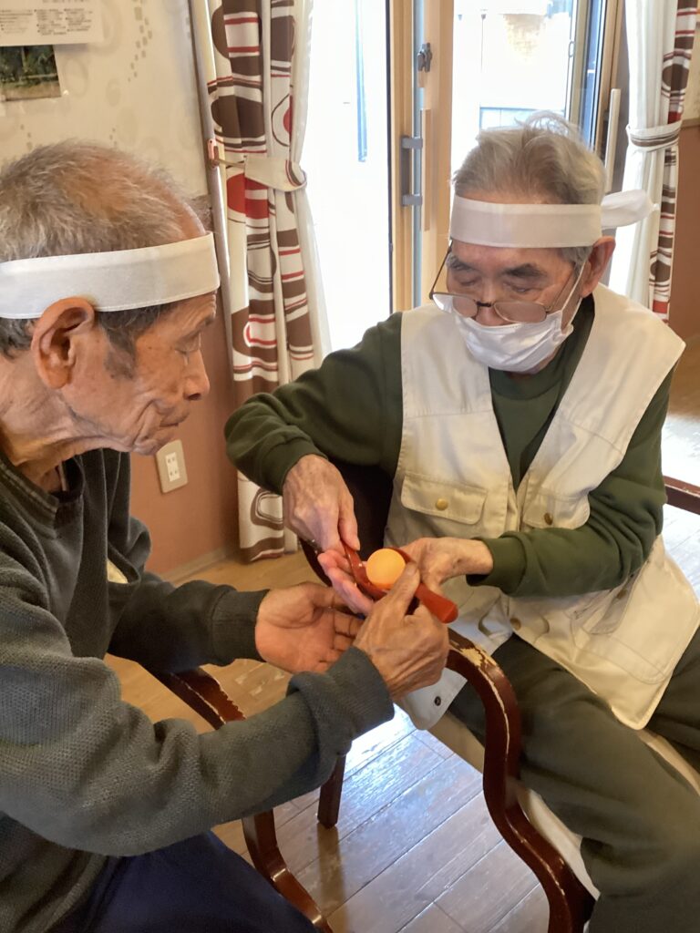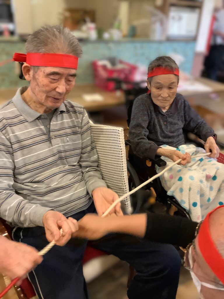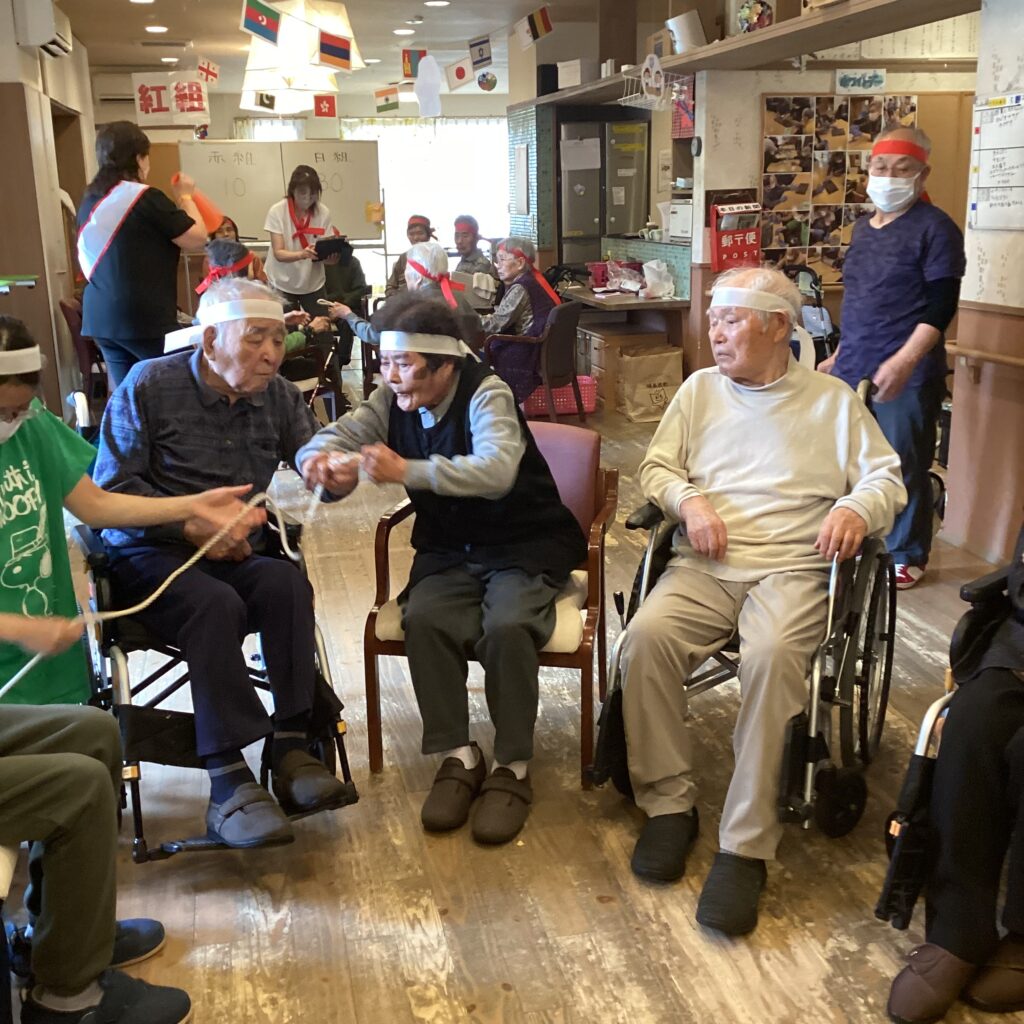 紐渡しゲーム!こちらもスピードとチームワークが要求されます。はい!はい!という掛け声と一緒に渡していきます