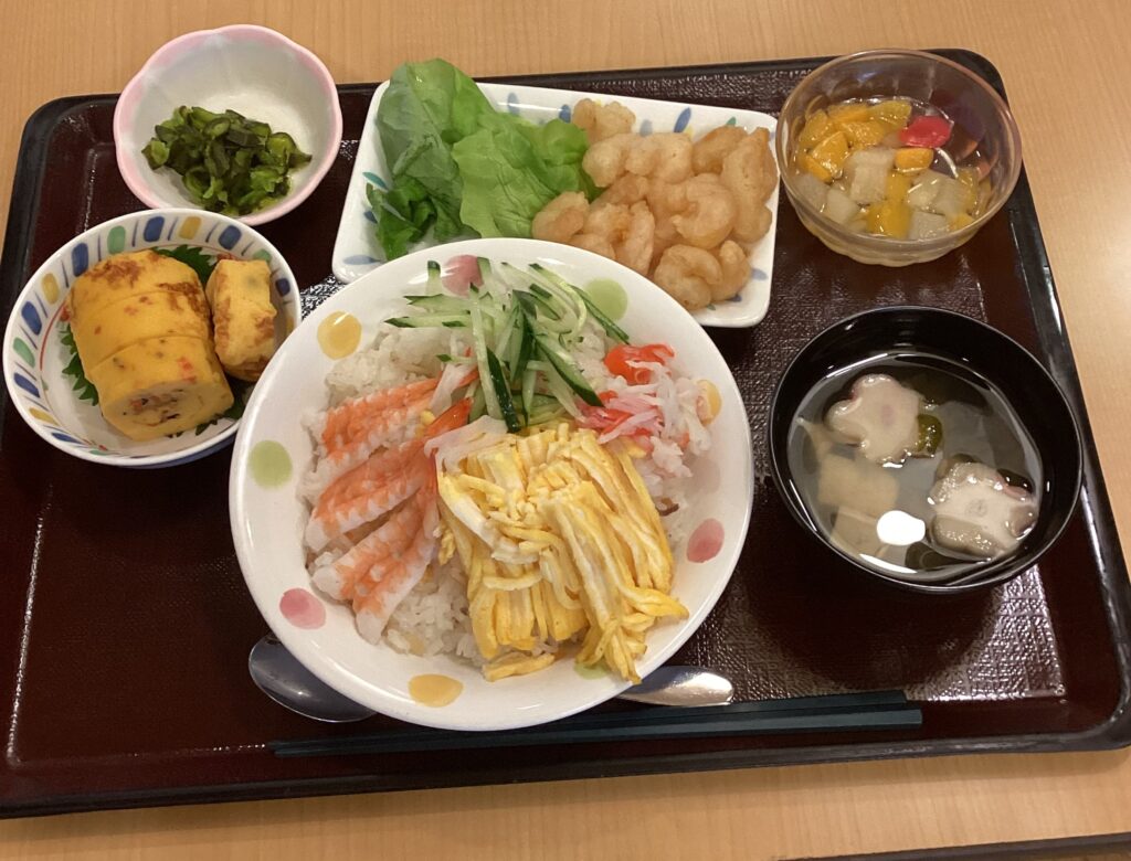お昼はエビのフリッターとちらし寿司!しっかり食べて午後の競技に備えます♪