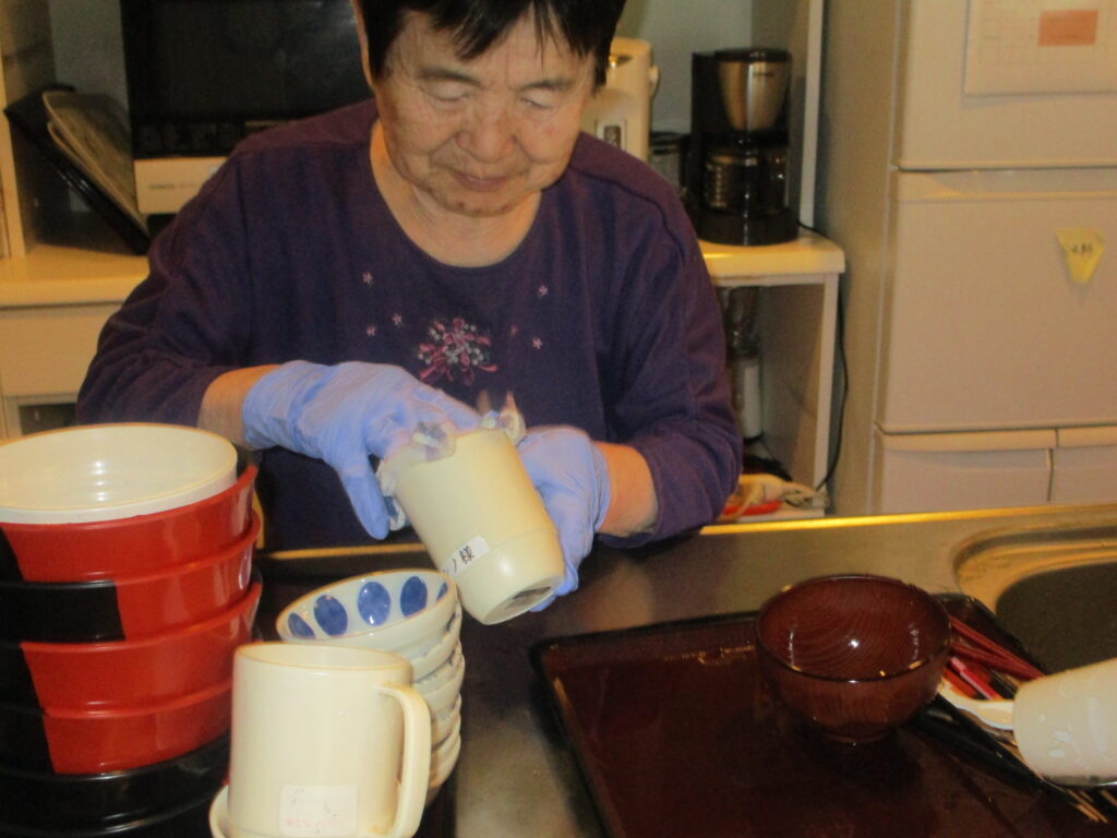茶碗を拭いたり、テーブルを隅から隅までピカピカにして下さっています。職員よりもきれいに、そして丁寧に行ってくれるのでとても助かっています。