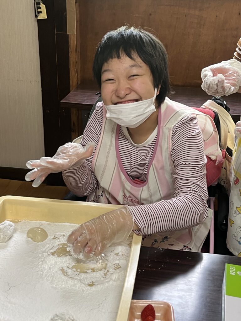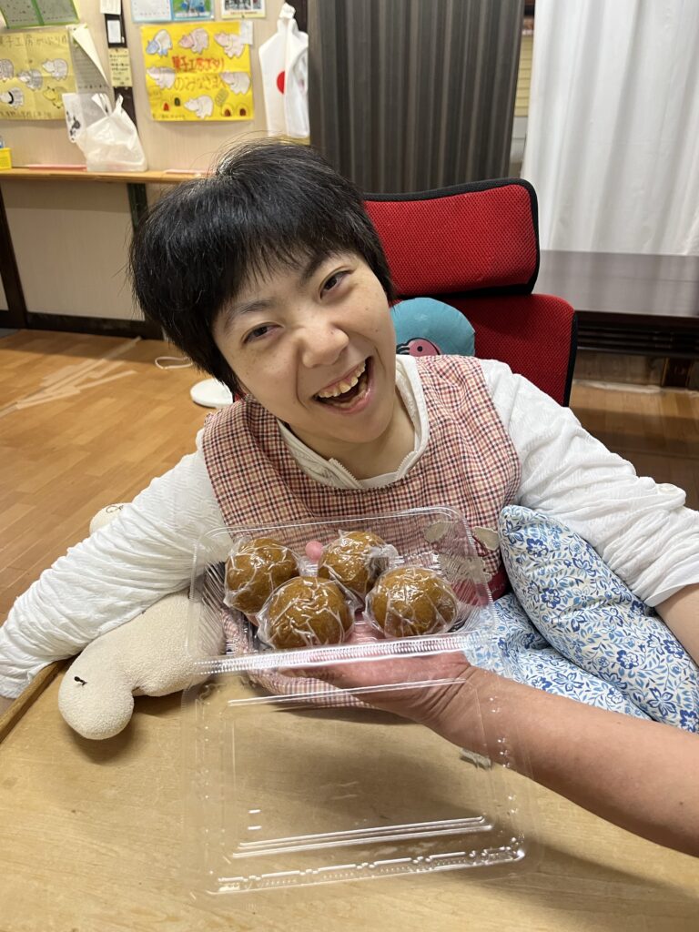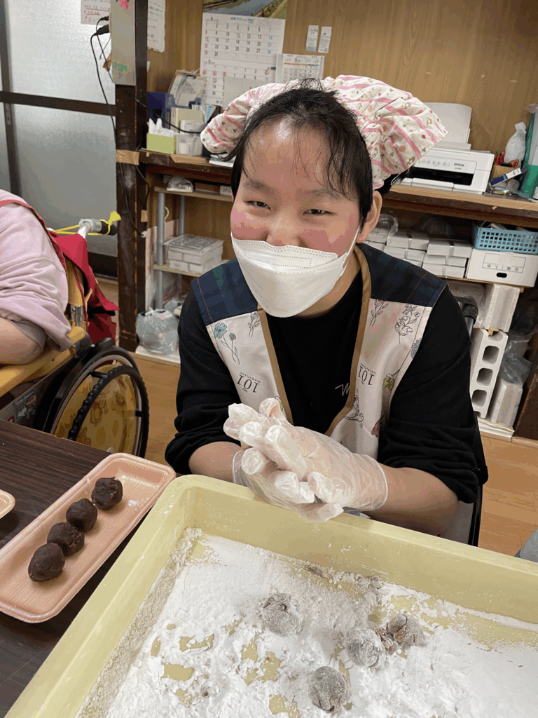 利用者さまそれぞれが、生地の上に丁寧にあんこをのせて丸く包んでいきます。