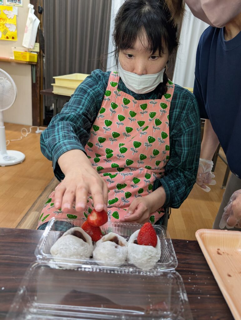 包んだまんじゅうを蒸し、フルーツ大福にはいちごをのせて、完成です!