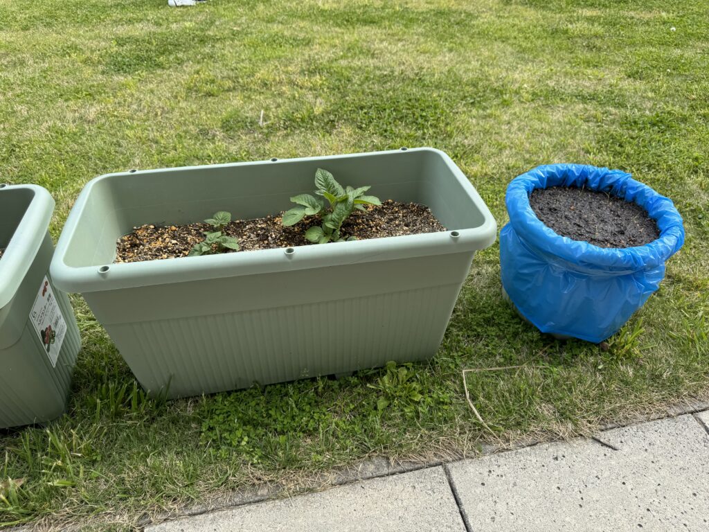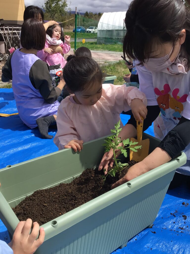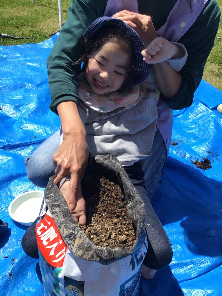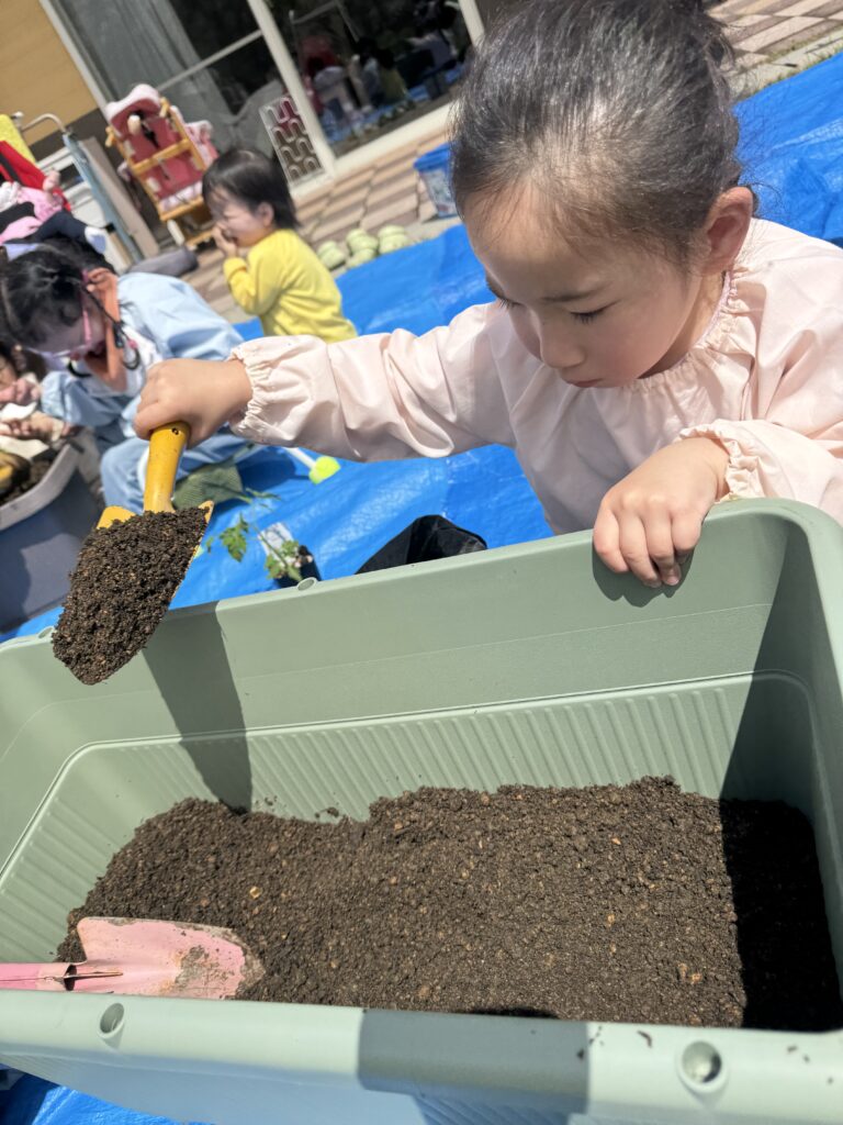 土を入れて苗を入れてまた土をかけて、、、小手を使って上手に土を入れます😊
