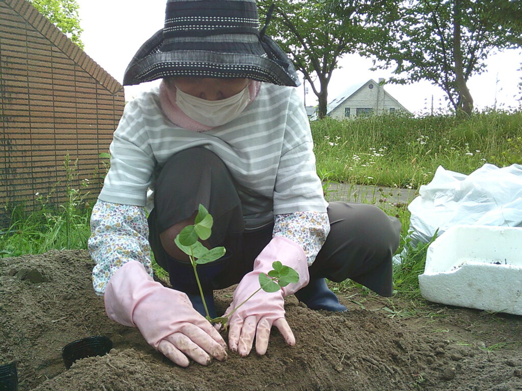 6月13日にポットに枝豆の種を植え、6月28日に育った苗を畑に植え付けました。