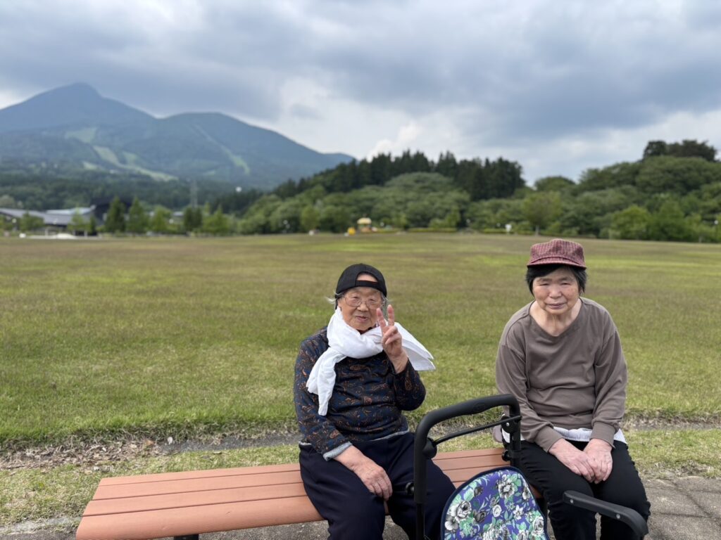ベンチに座ってみんなで休憩!磐梯山をバックに記念撮影📷今度は天気のいい日にまた来ましょうね