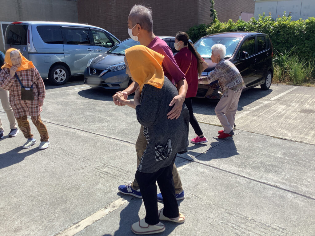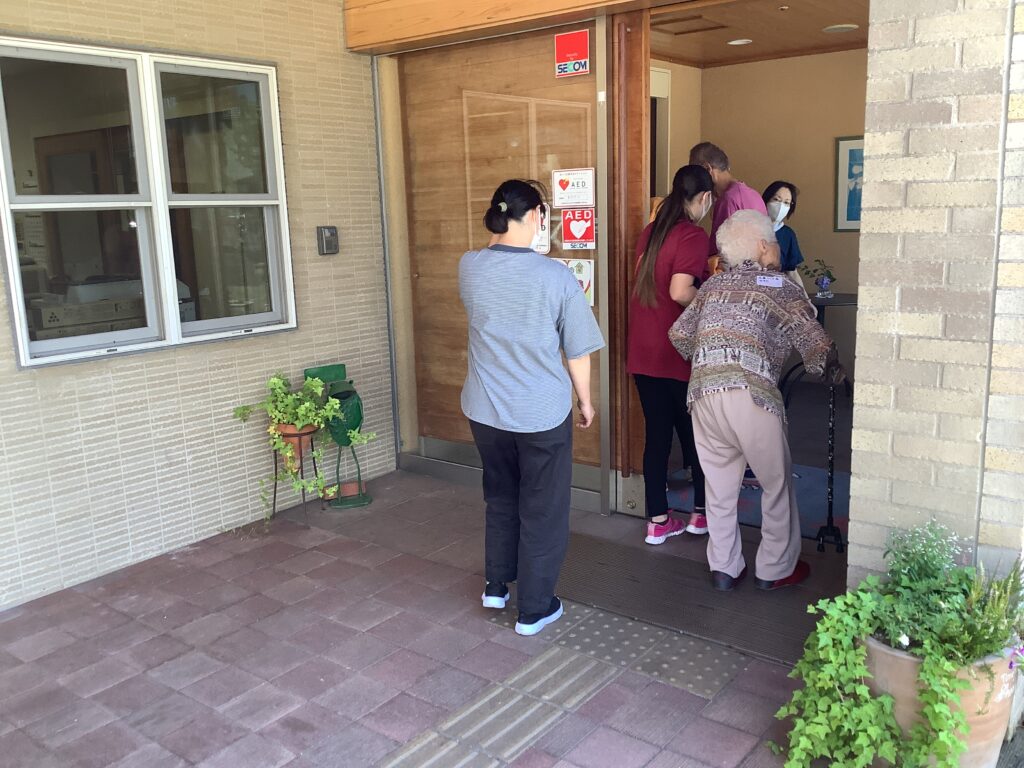 通報したあとは、全員 鼻と口を覆い避難開始。ご参加していただいた地域の方には車椅子を押していただきました。