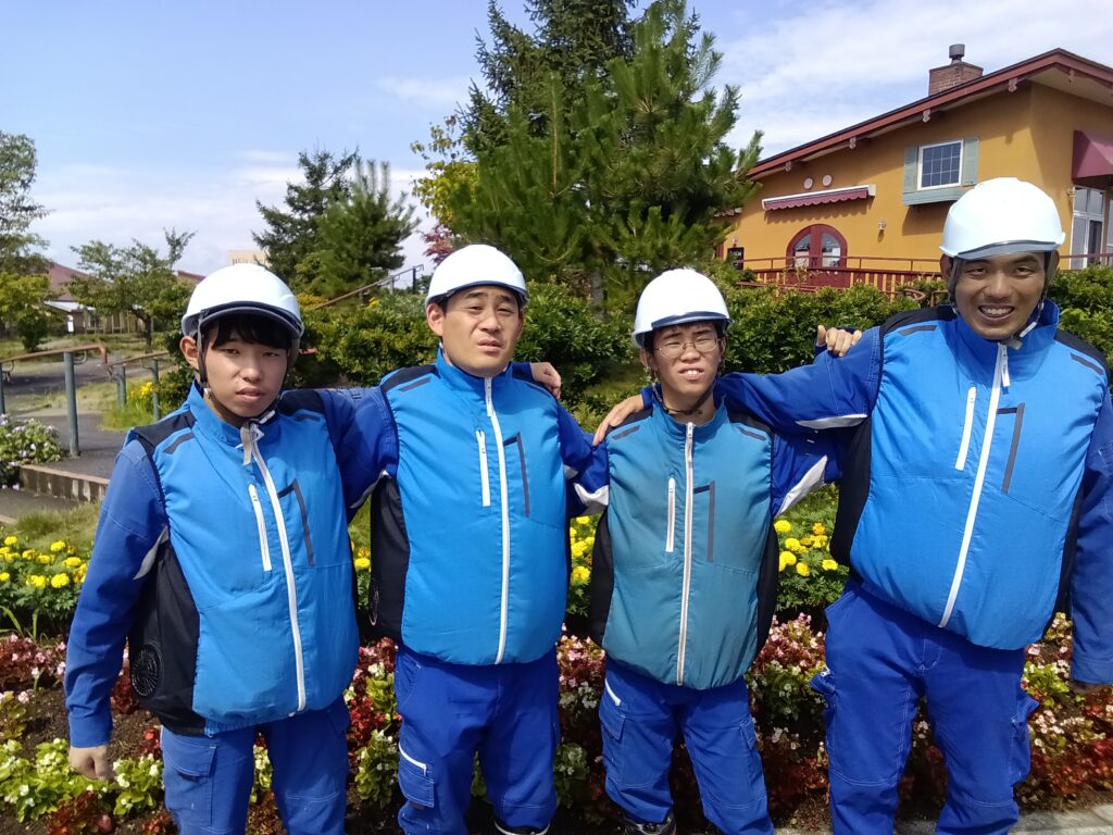 夏場は、お揃いのサマーブルゾンユニフォーム・空調服・保安帽で取り組んでいます。