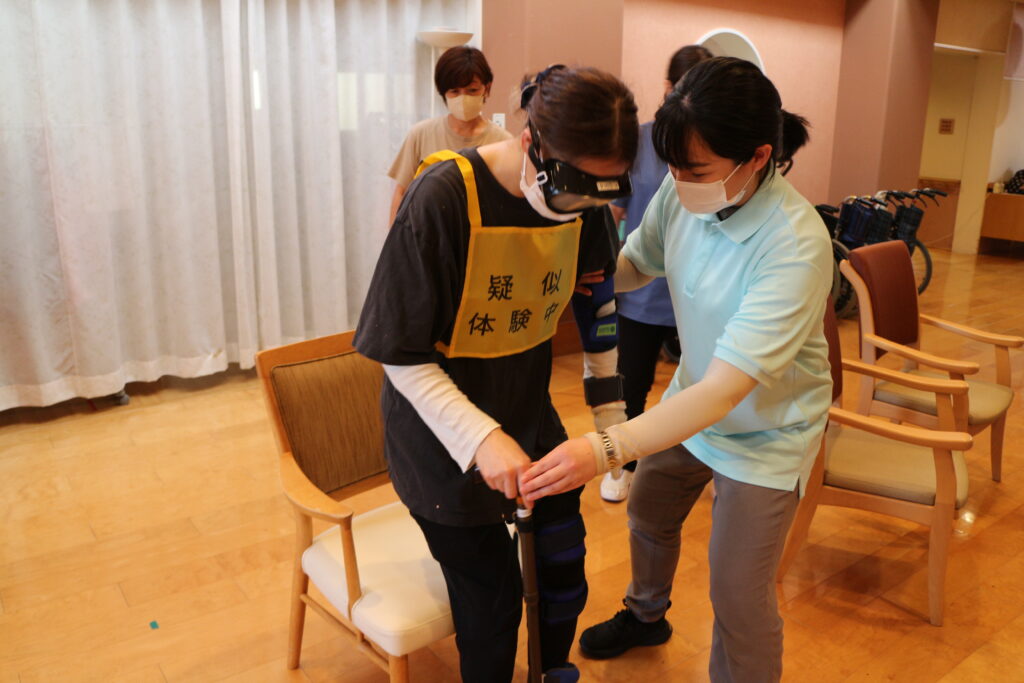 先日、職員研修として【高齢者疑似体験】を行いました。中途職員だけでなくベテランの職員も対象としました。