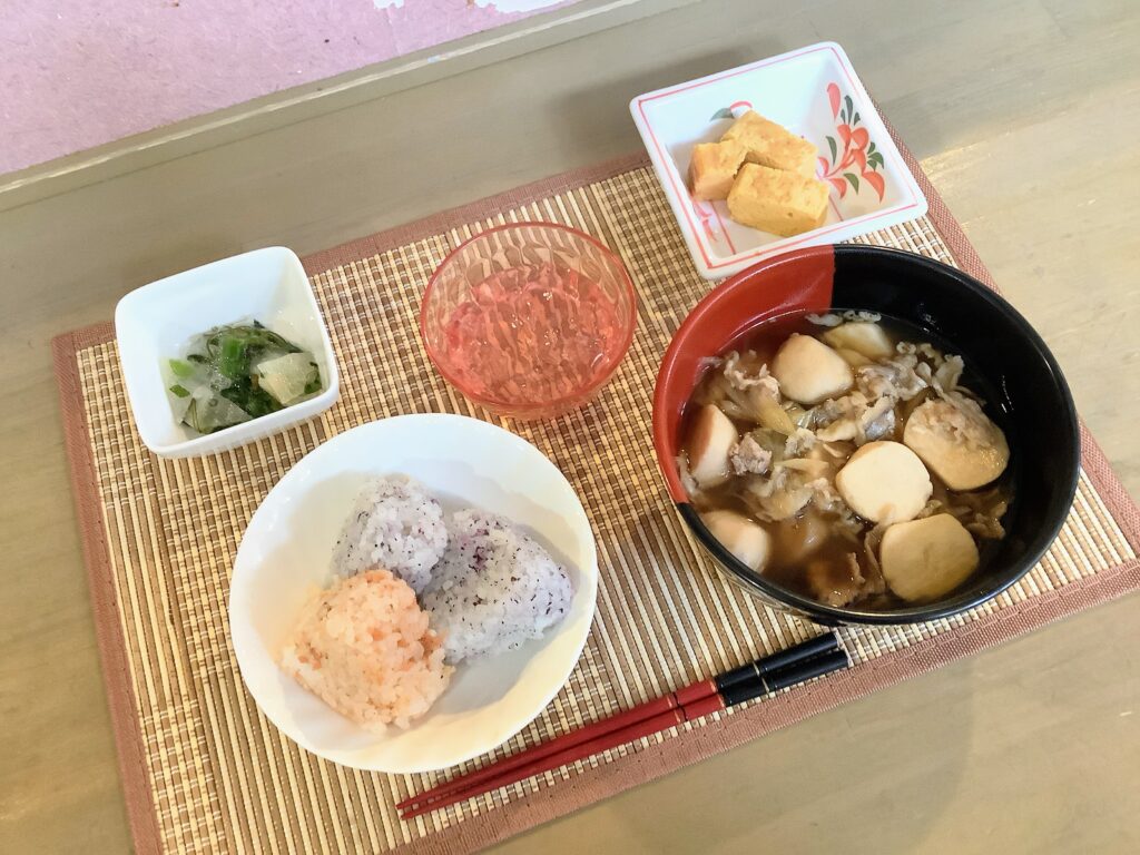 ごはん / 芋煮 / 厚焼き卵 / おみ漬け昆布 / さくらんぼゼリー