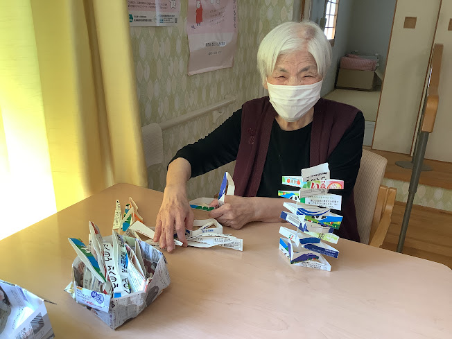 牛乳パックを静かに落ちないように重ねて手の運動中(^_-)-☆