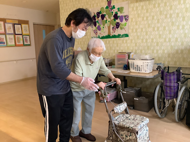施設内をスタッフと一緒に!一周約100歩です。天気の良い日は外で・・・青空が応援しています(*^^)v