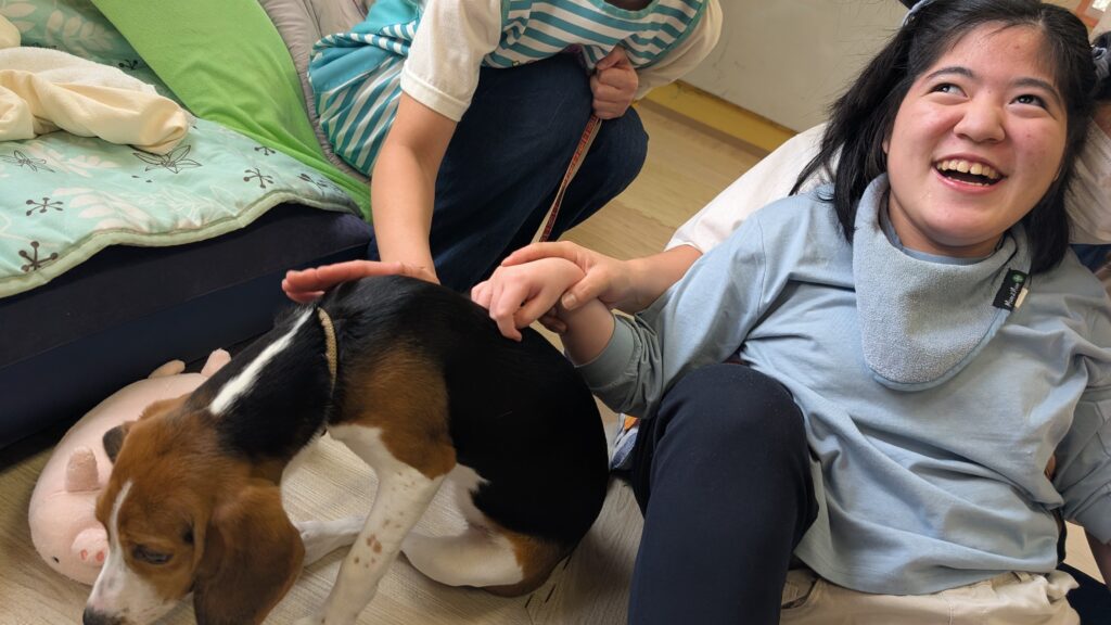 わんちゃんとの交流は、ハプニングありの大笑いでしたね。