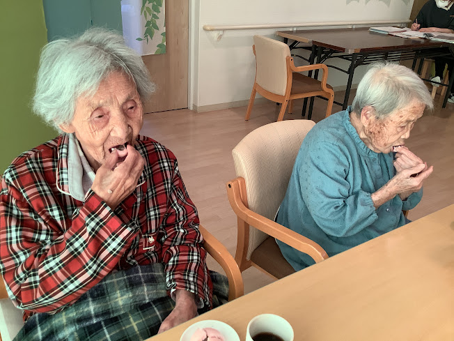 紅白まんじゅうをそっと口にする二人です(^O^)