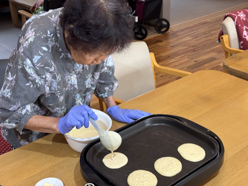 おやつ作り🥞♪【ハーモニーみさと】 ミサトベース(ハーモニーみさと) 2025年9月22日 3時のおやつにホットケーキを焼くことに🥞♪ ホットケーキを焼いてると早くひっくり返したくてソワソワしちゃいますよね🤭 出来上がったホットケーキには はちみつ、チョコソース、黒蜜など好きな物を付けていただきました🍴