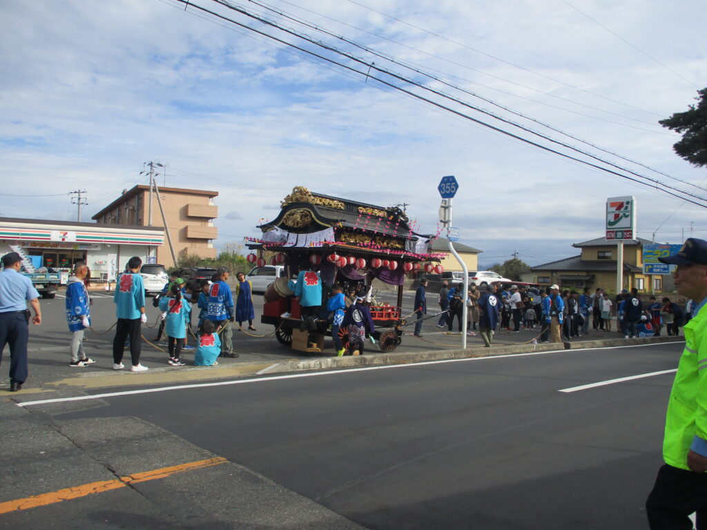 子供たちが太鼓、大人たちが太鼓台を引っ張ります。参加は自由で誰でも太鼓台を引っ張る事が出来るようです。