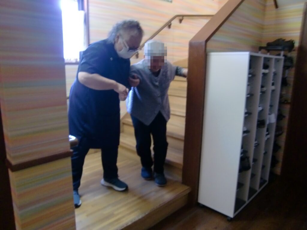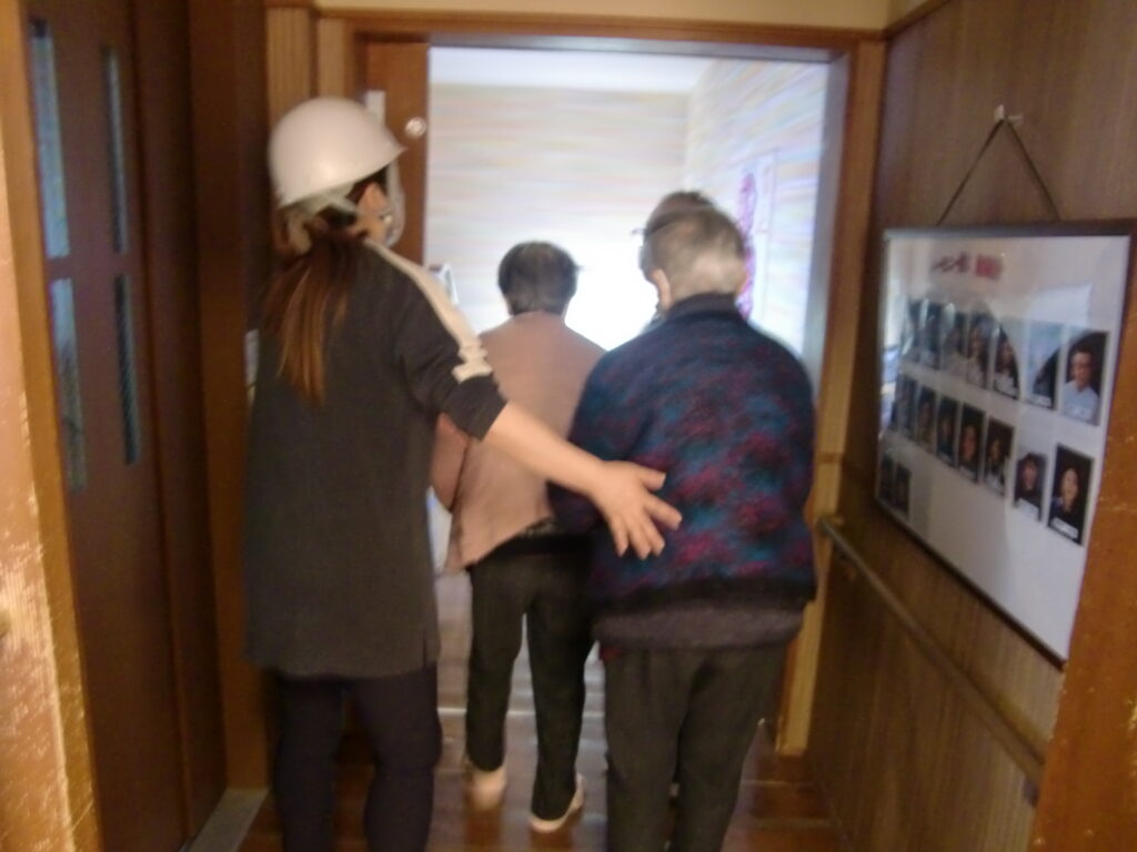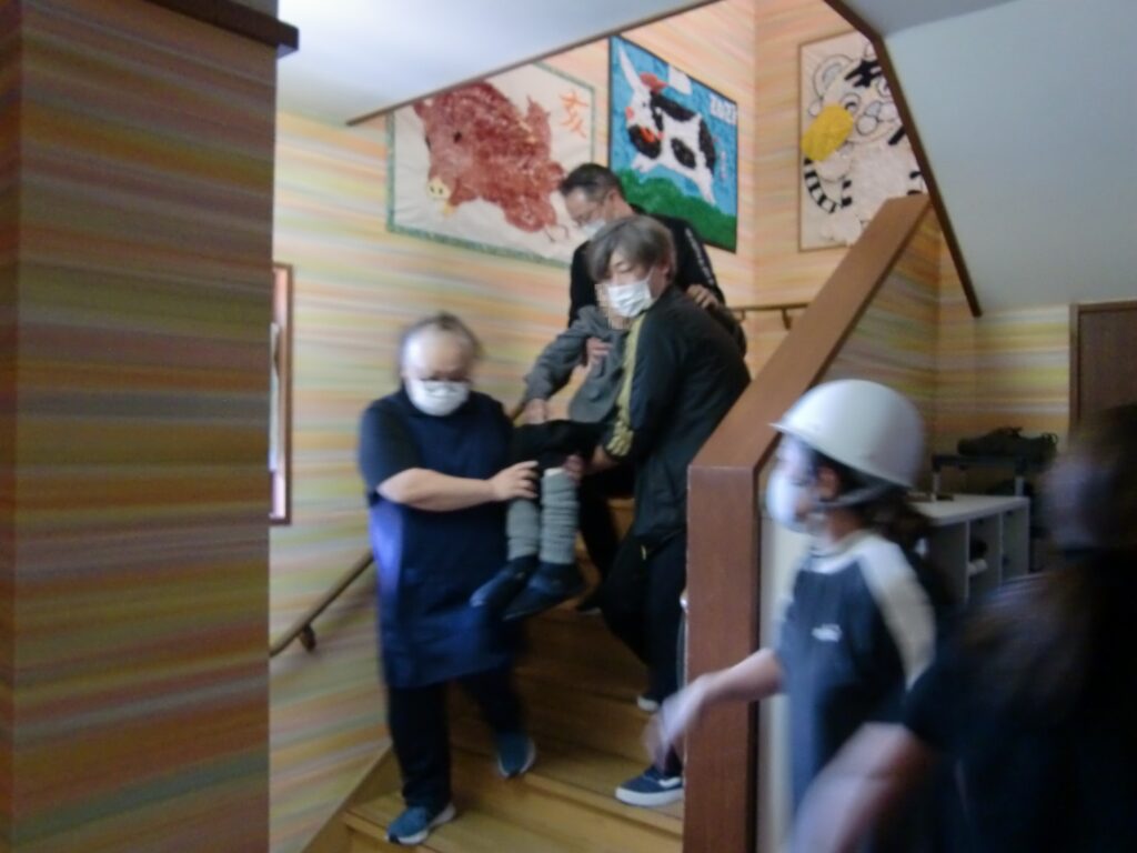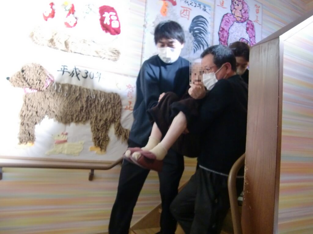 エレベーターが使用出来ないため、歩ける方は職員付き添いで、車椅子のお客様は職員が数人で抱え階段からおりて避難しました。