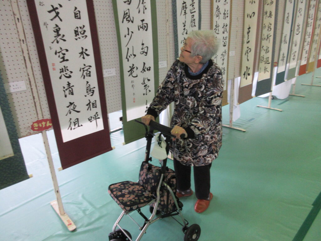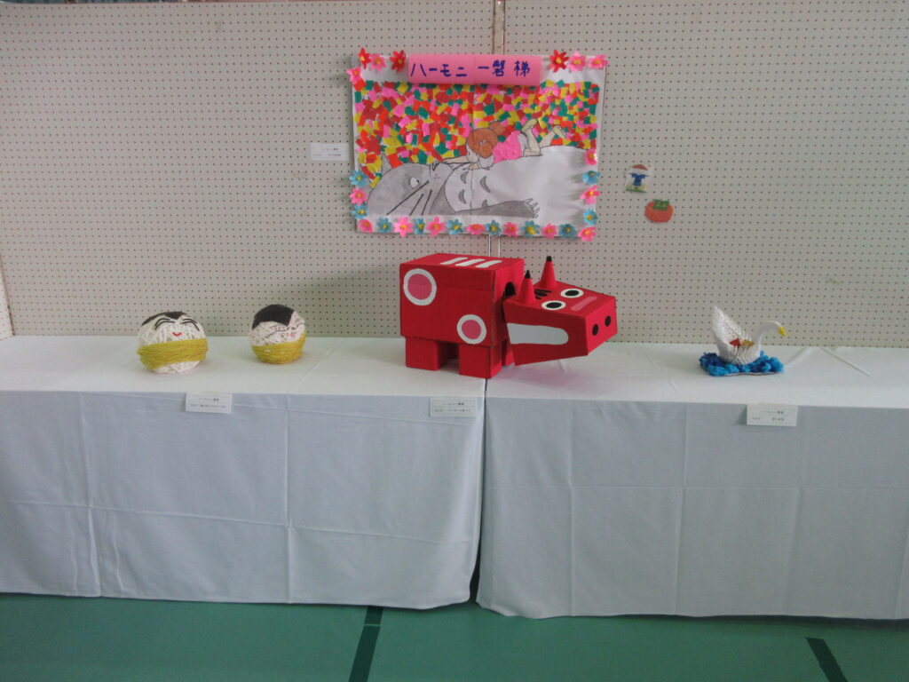 広い体育館の中を「私たちの作品はどこかな~?」と探しながら、他町民の方の展示品も見ていきます。