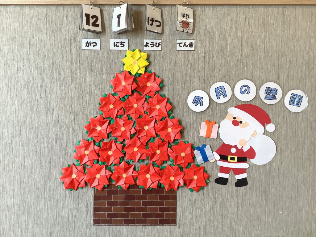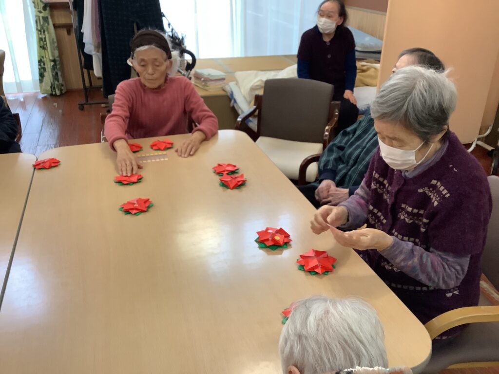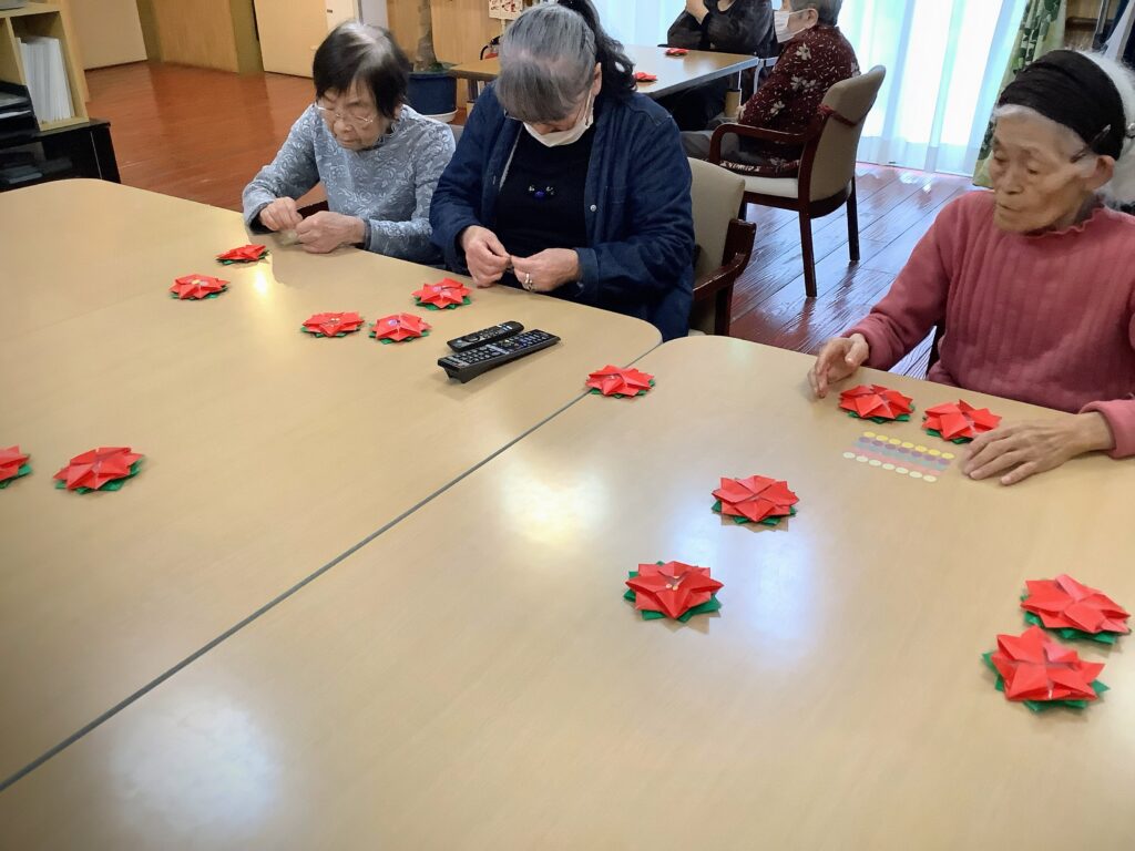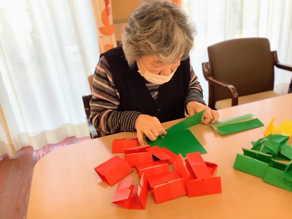 赤と緑の折り紙を折って、、