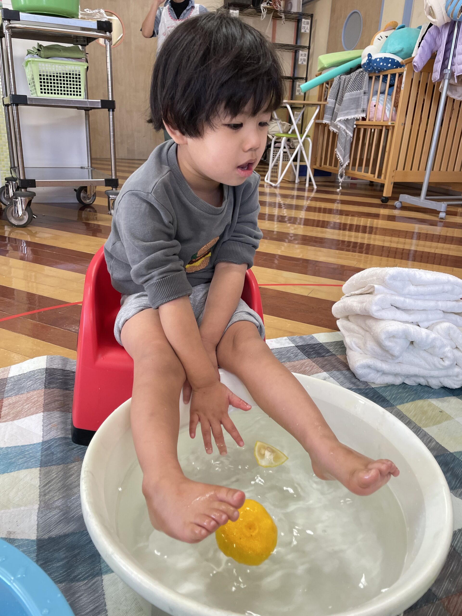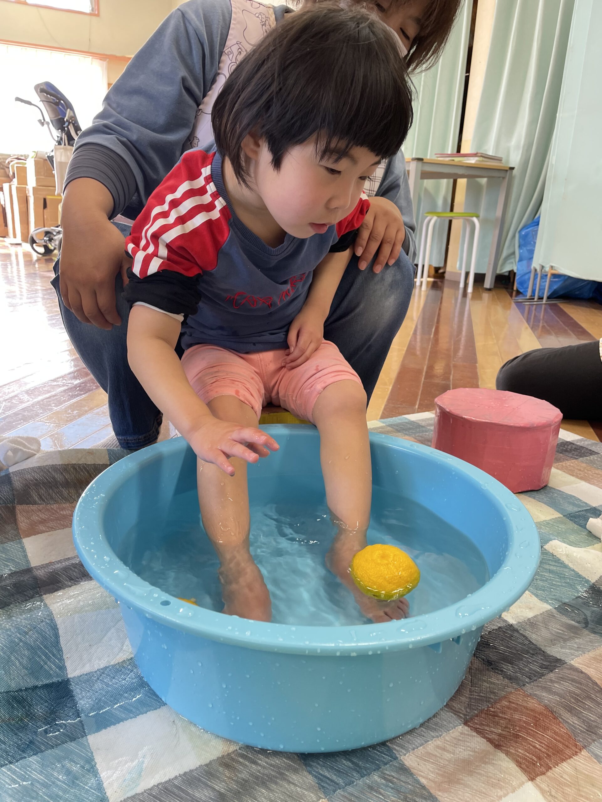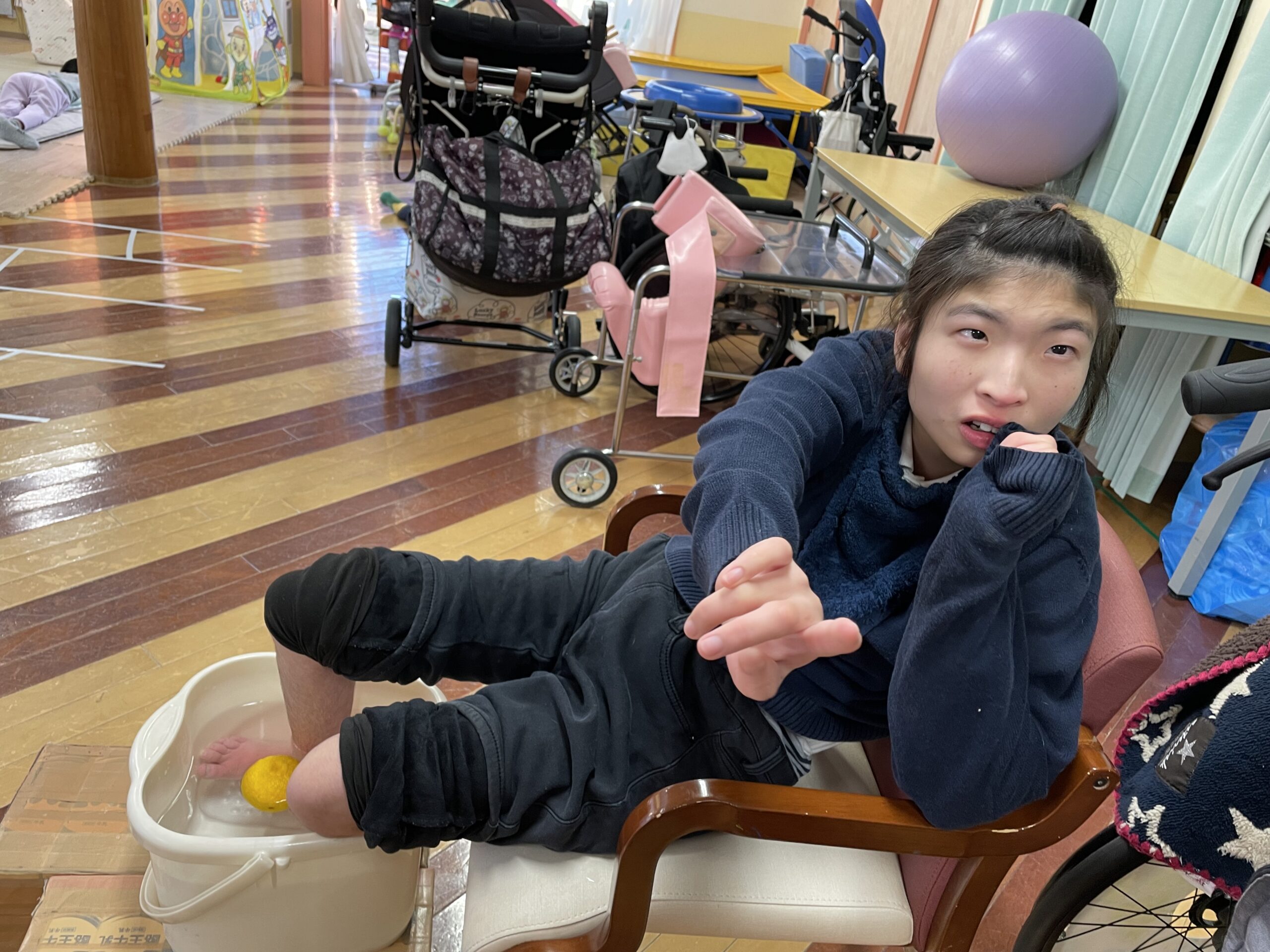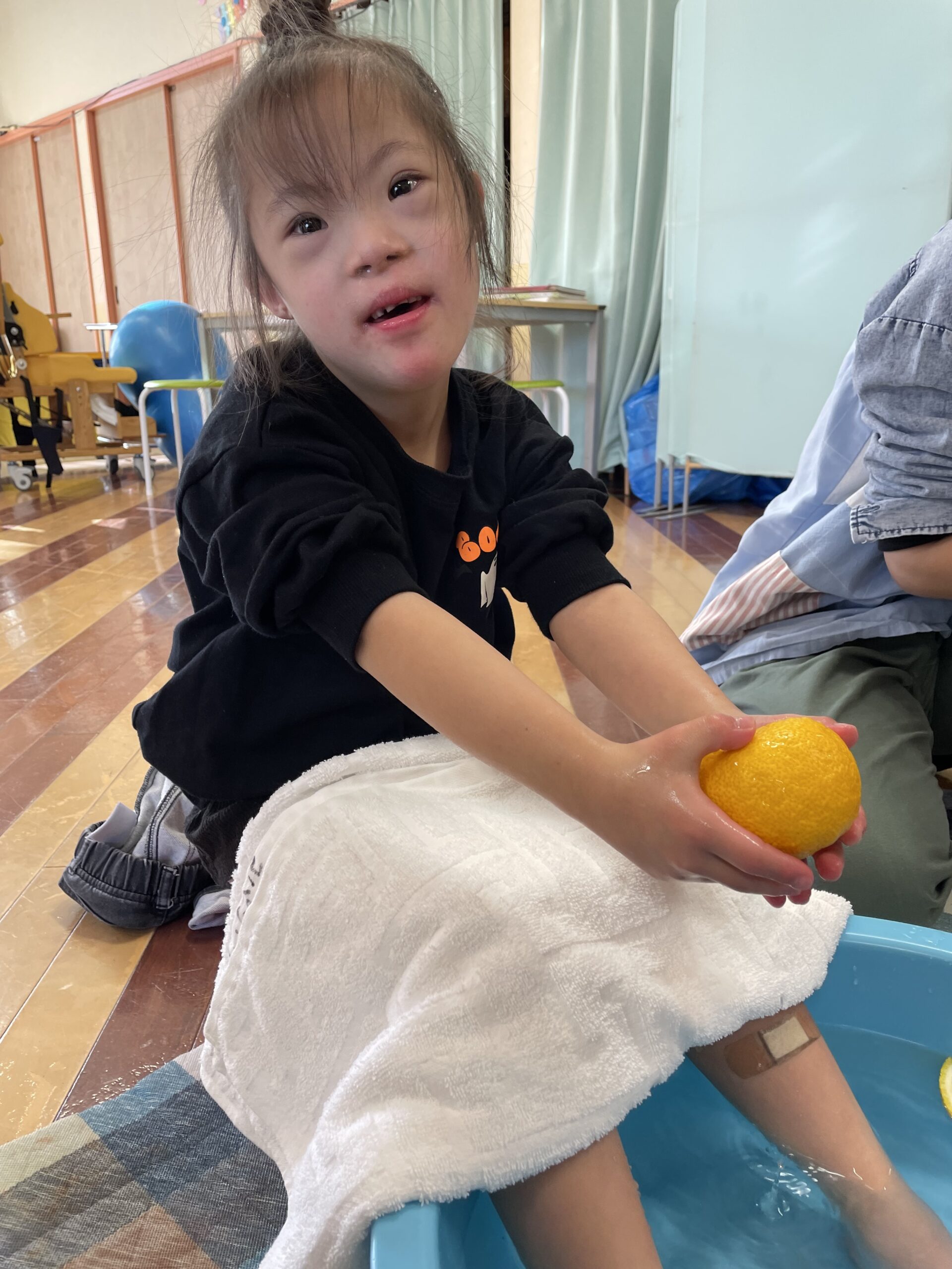 ゆずを手に持ったり、足で転がしたり・・・そして香りを楽しみながら、リラックス足浴タイム♨