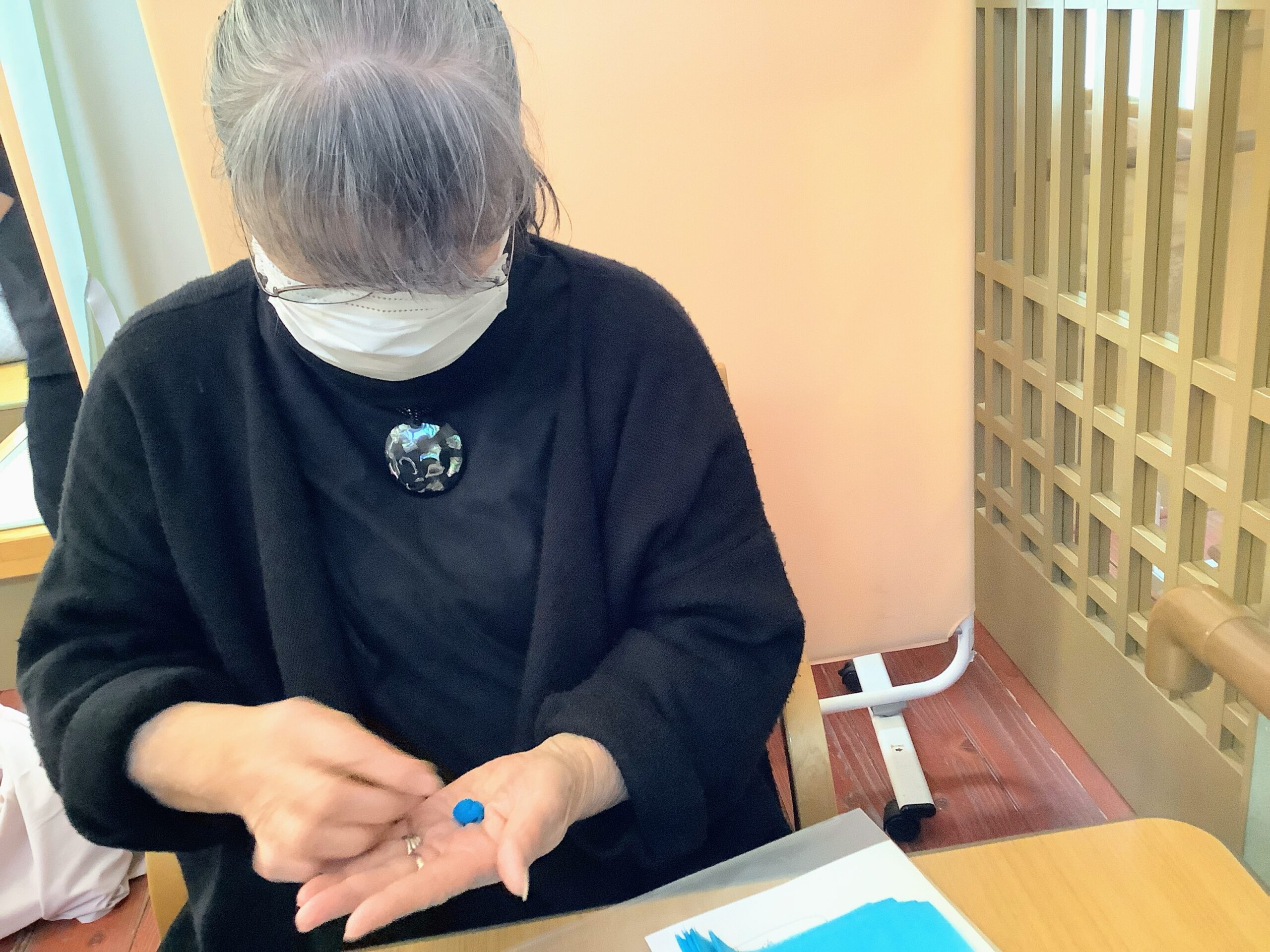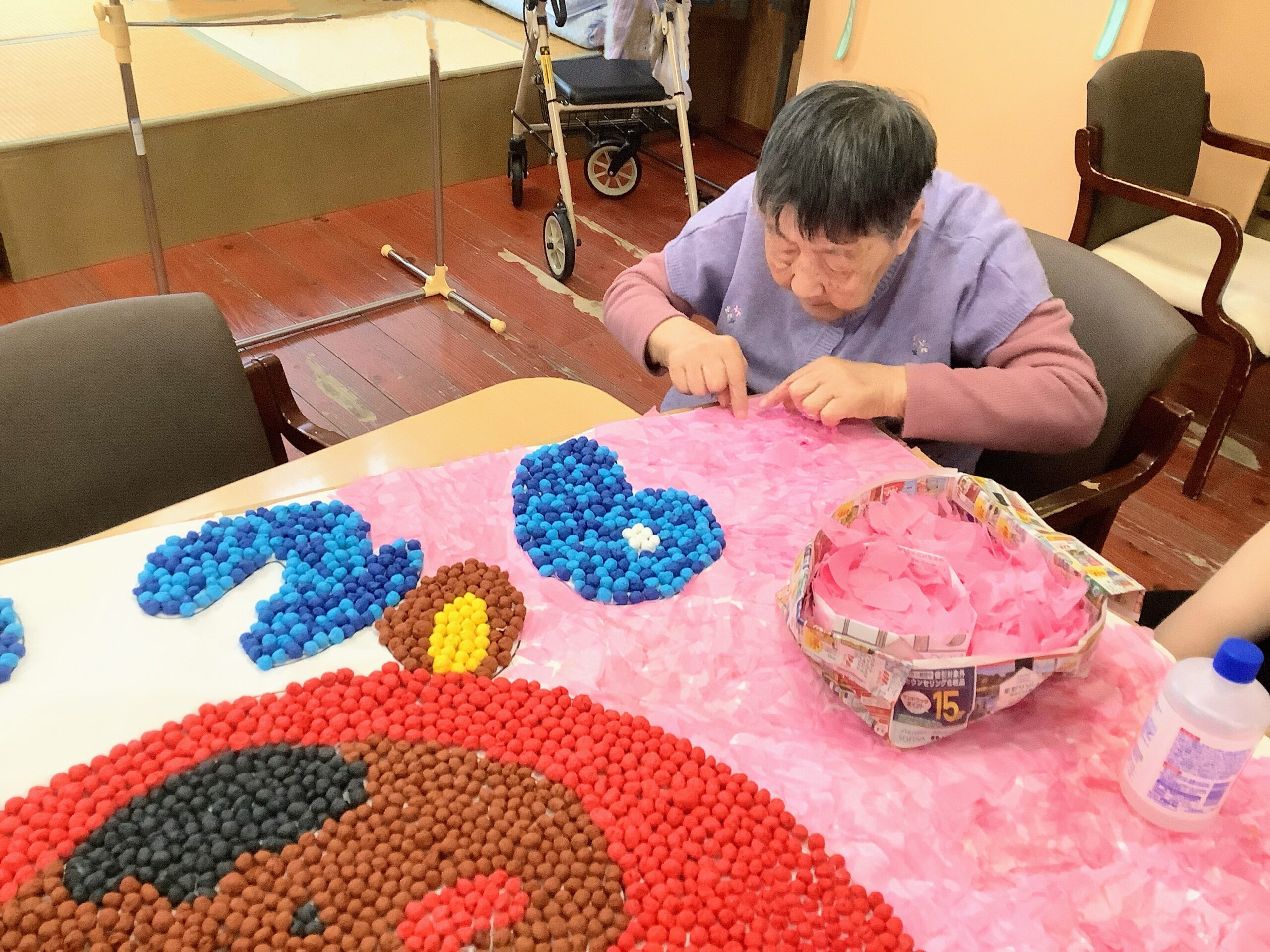 お花紙を半分に切って、水をつけて丸めます