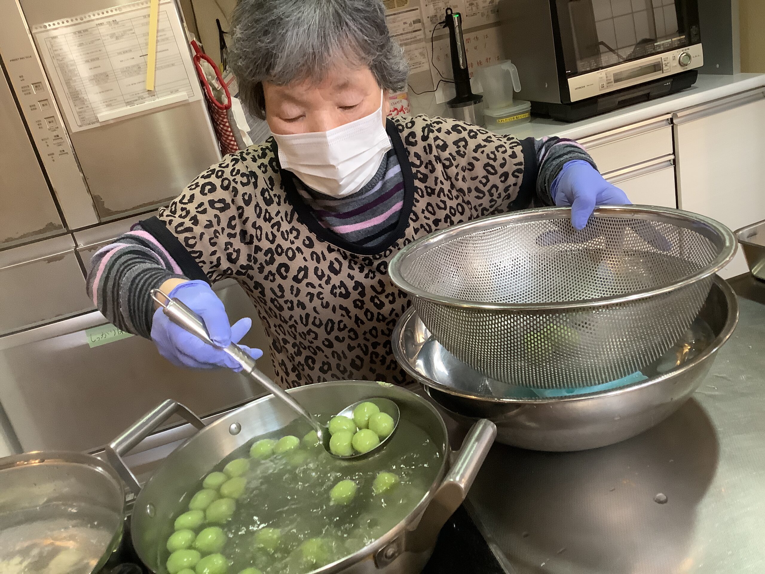 団子は3色に色分けをして、ちぎって…丸めて…湯通しして…と、