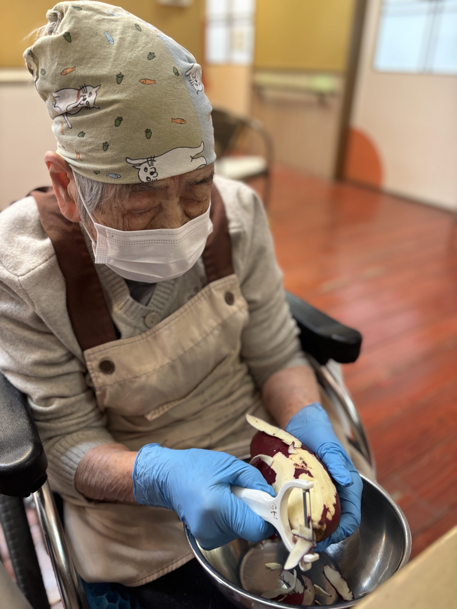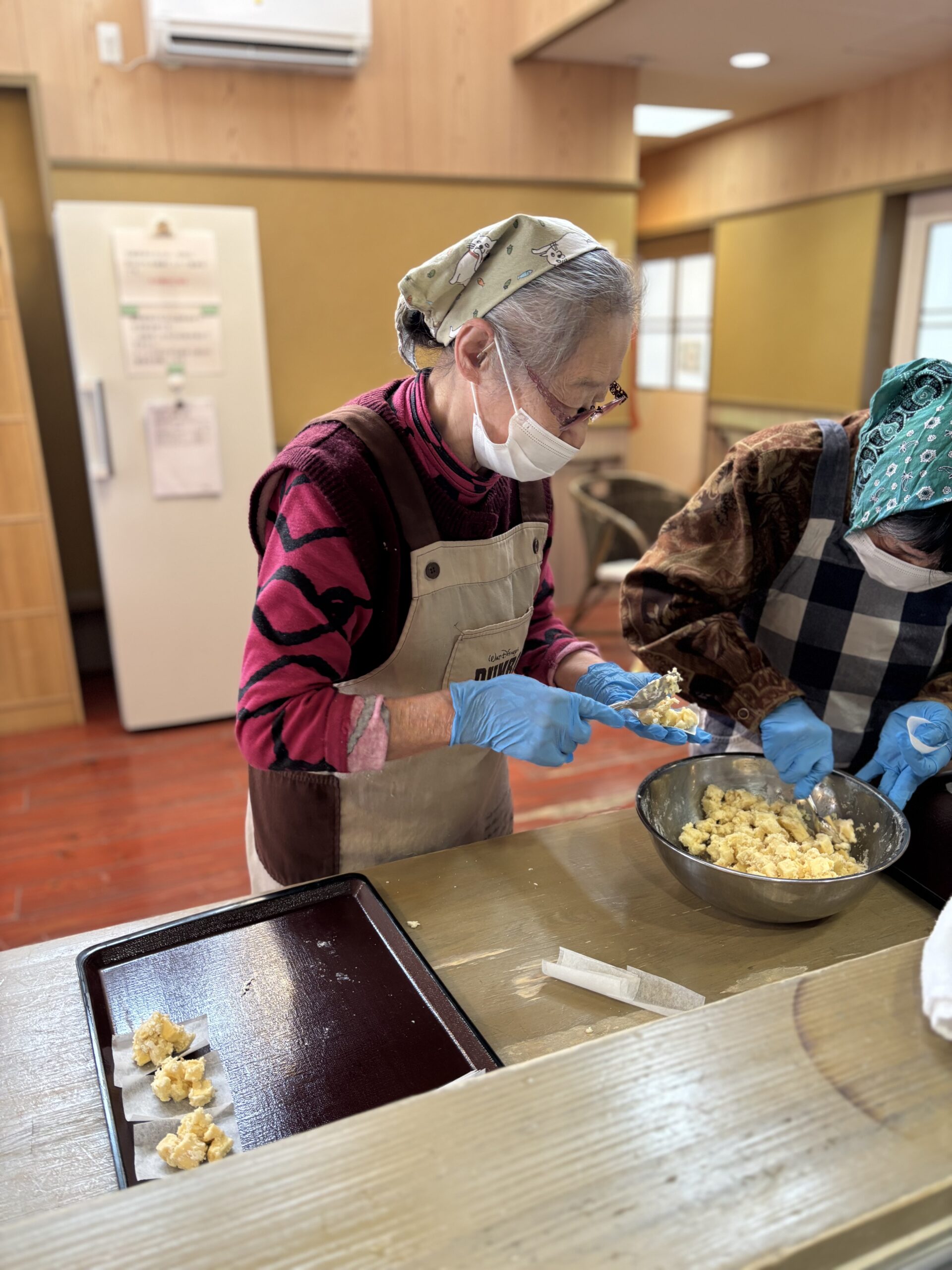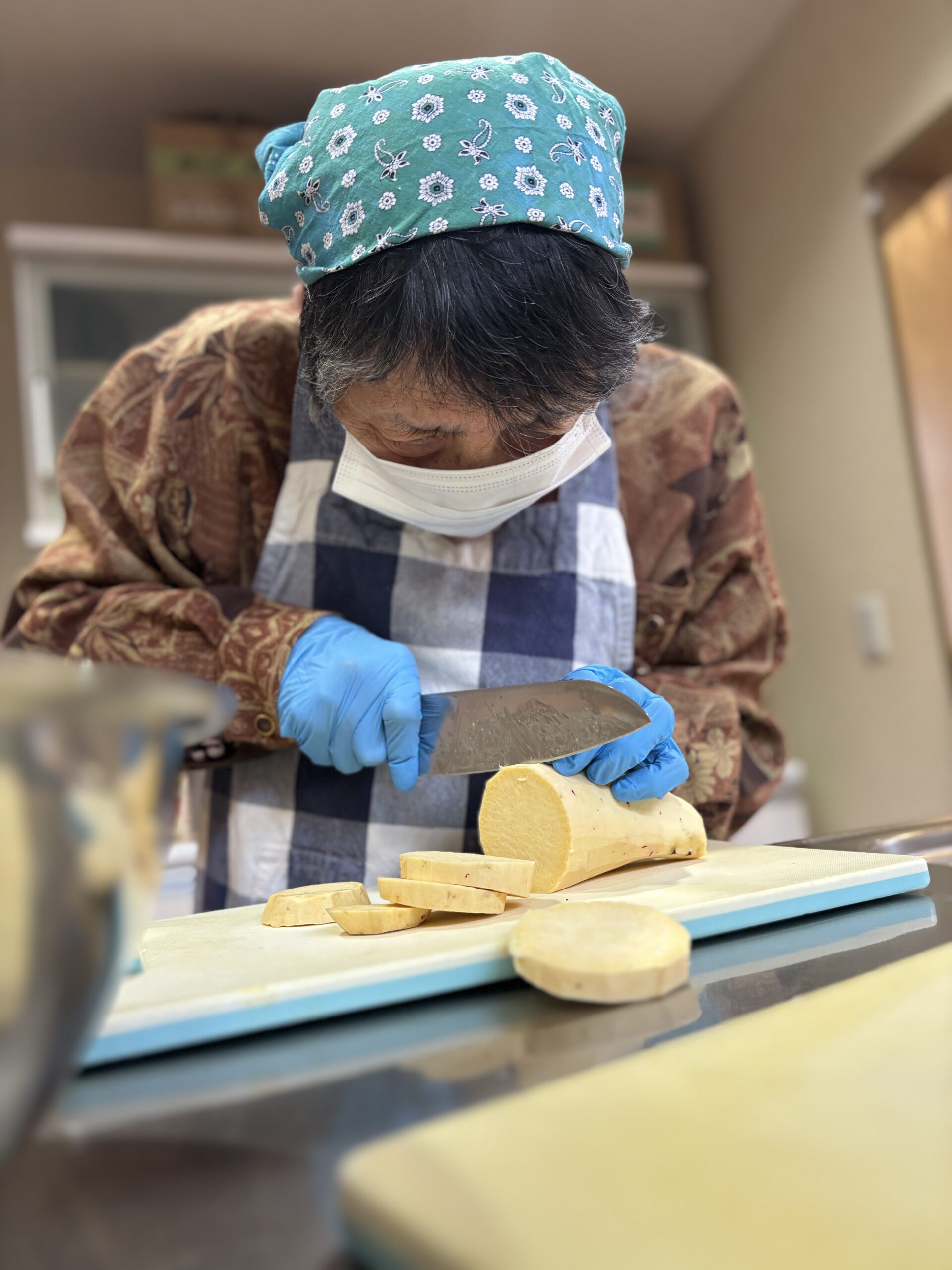 皆様にサツマイモを切っていただいたり、生地を混ぜていただいたり。少し硬いサツマイモも手慣れた手つきで角切りにしていきます!!