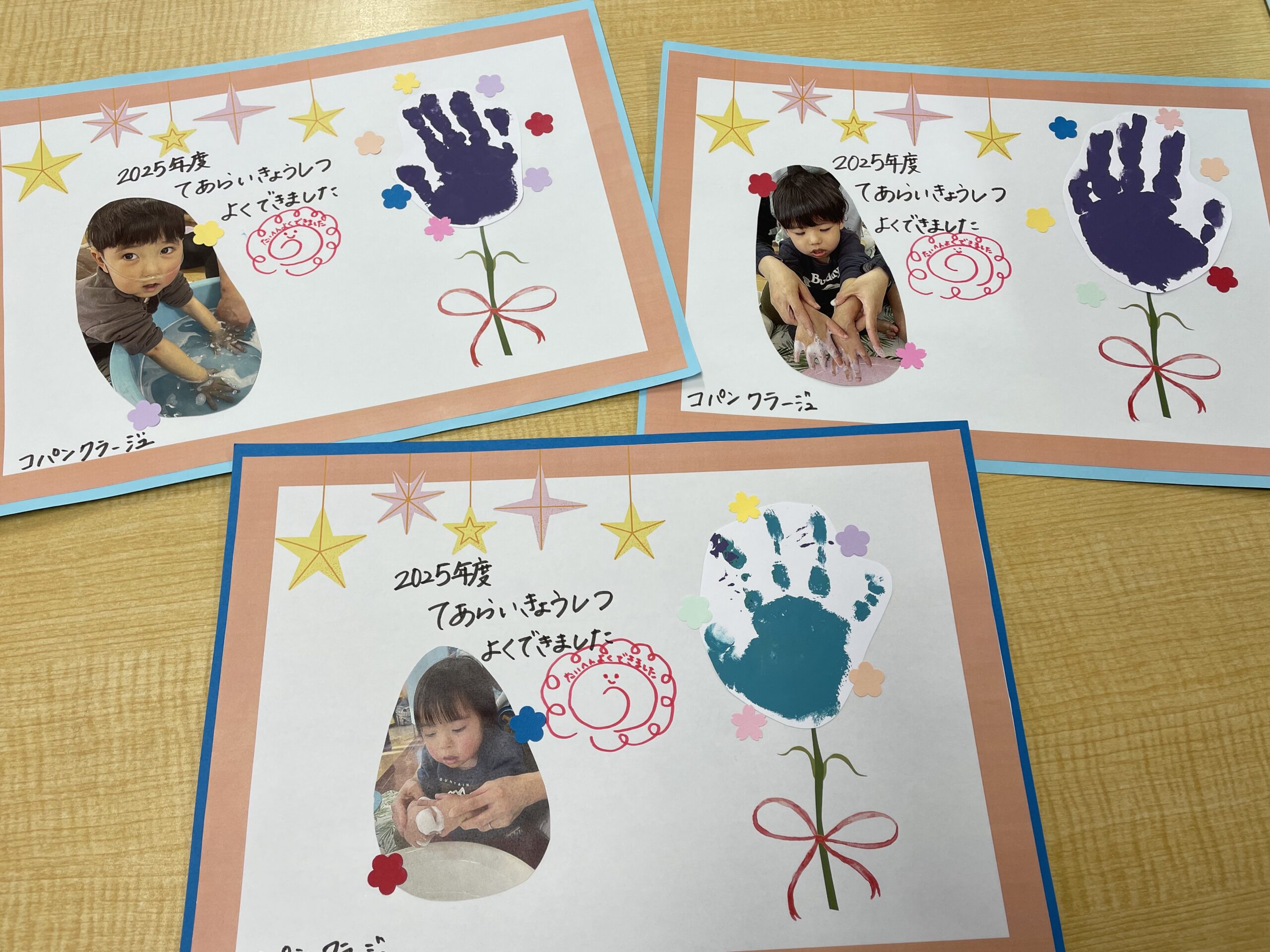 手洗い教室に参加した証として、最後には可愛い写真と手形のお花付き賞状をもらいました!