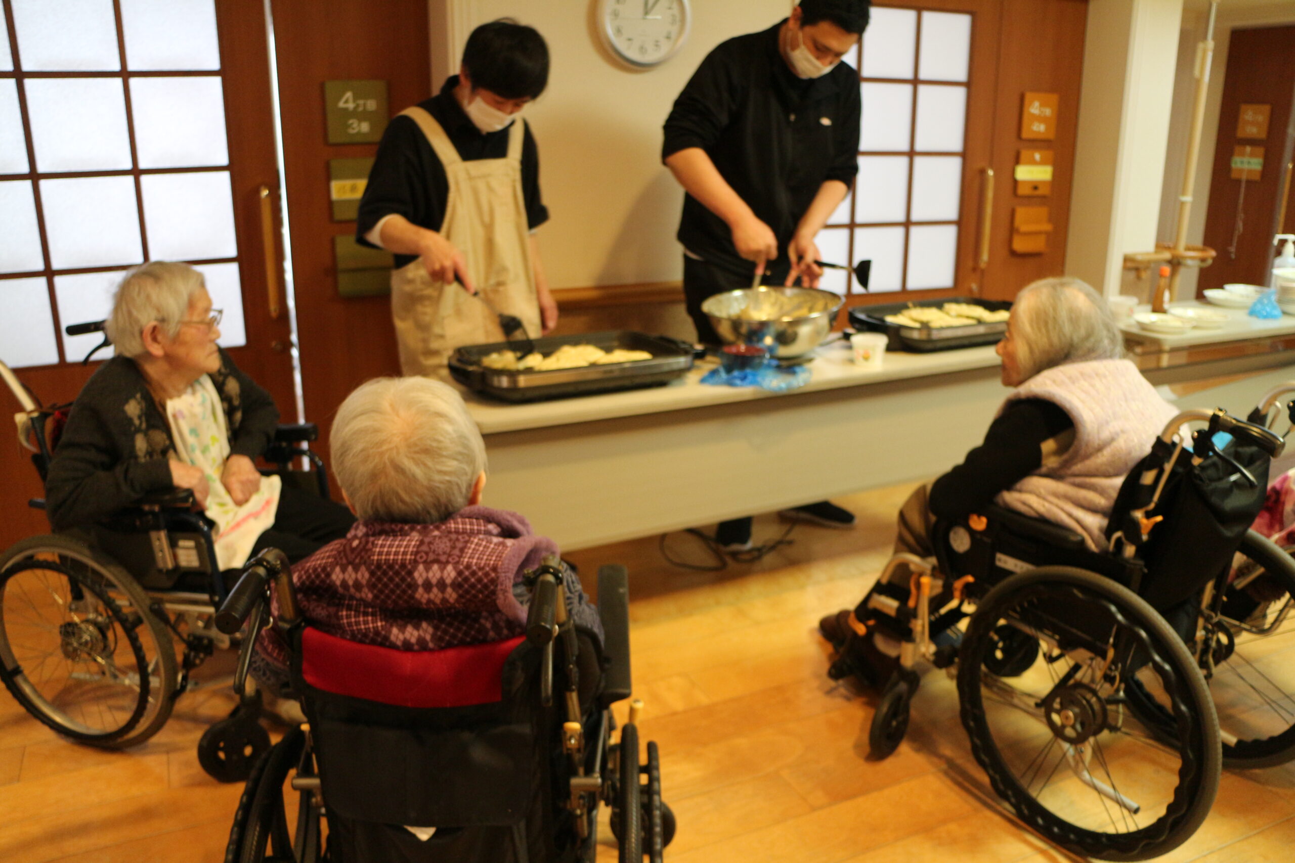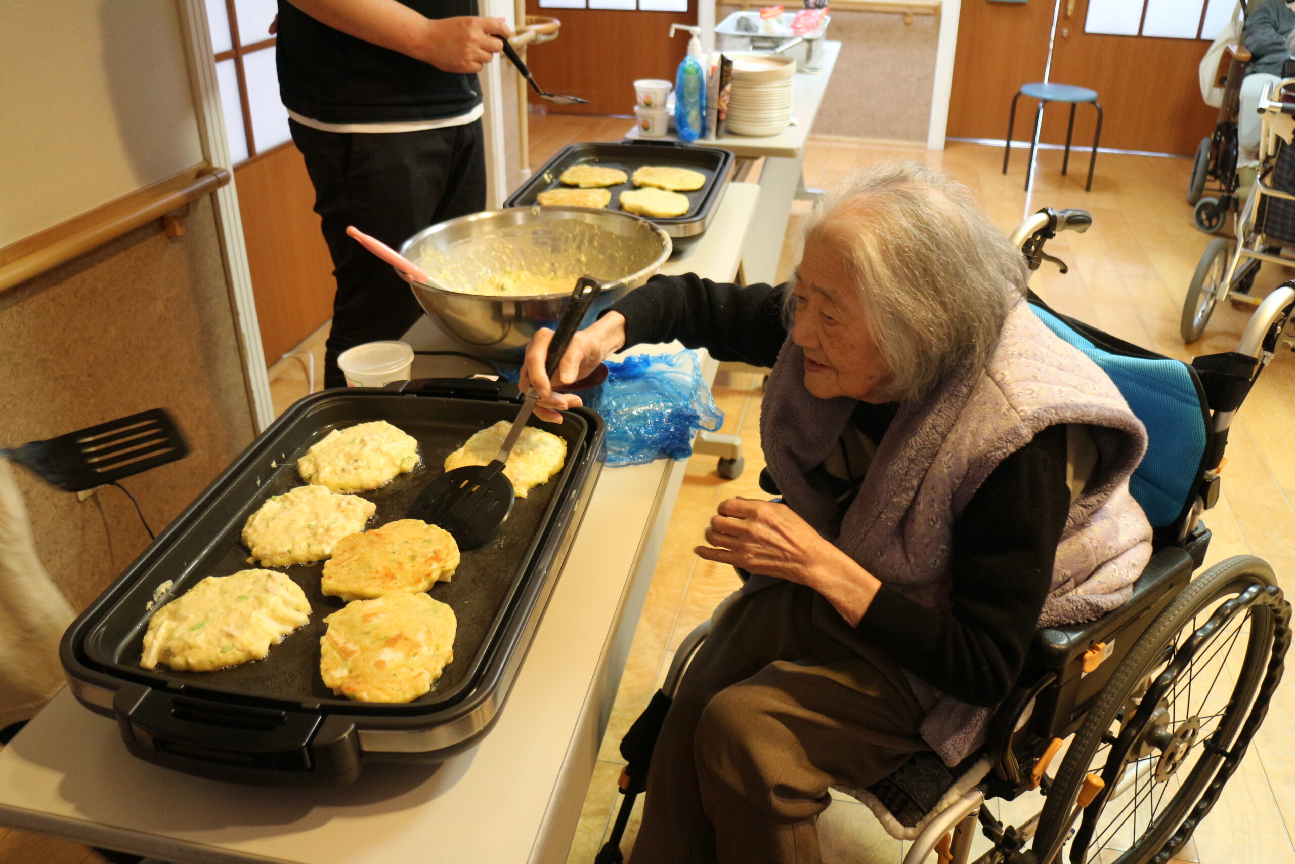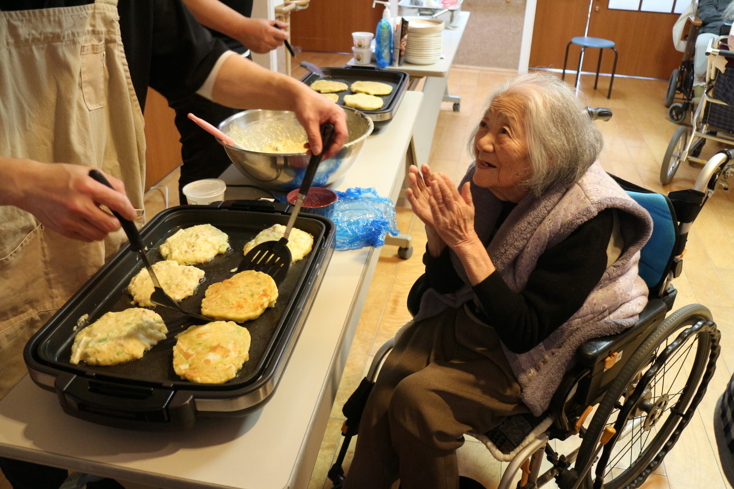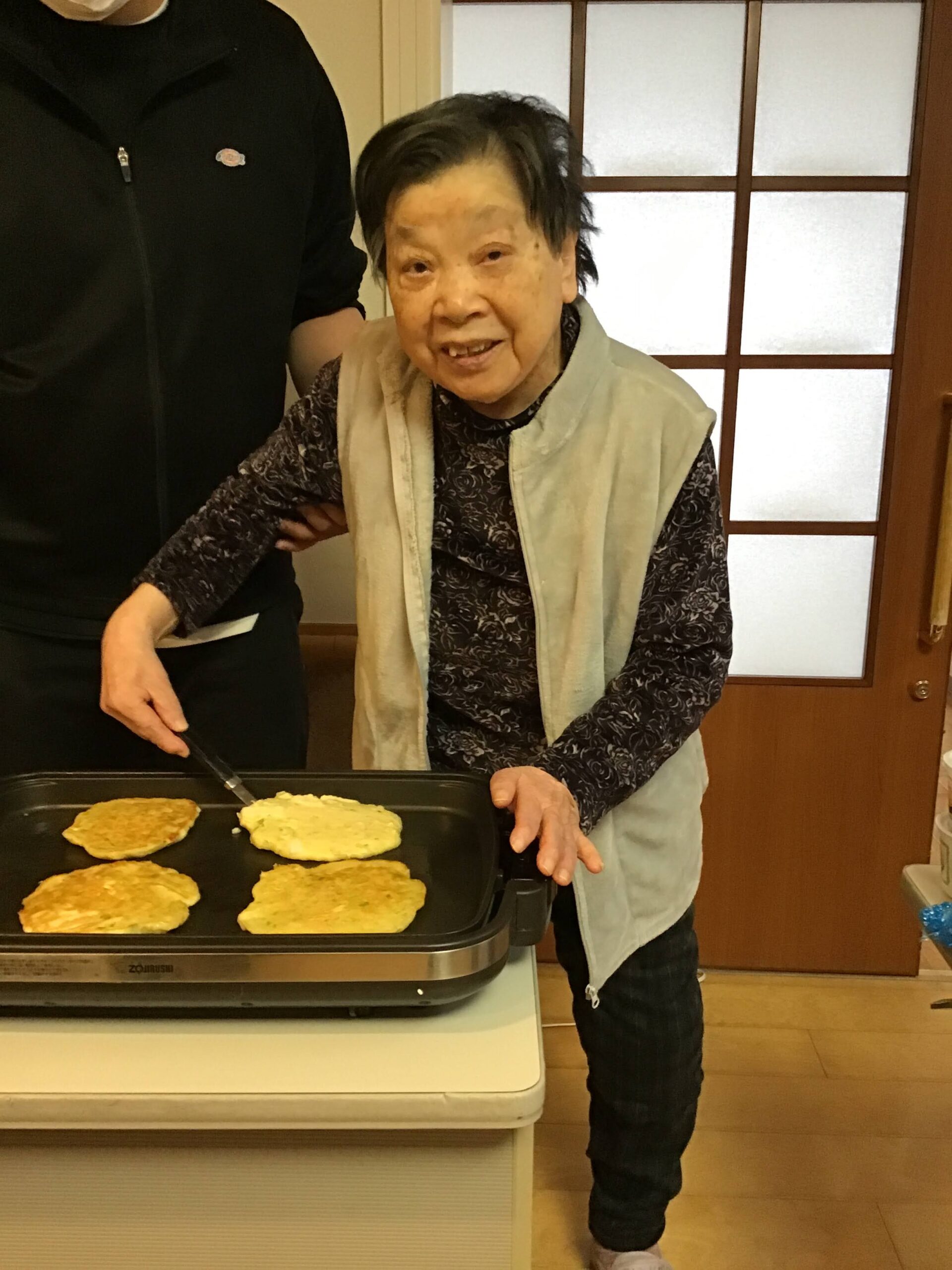 職員がお好み焼きをひっくり返すと「上手やな」と褒めてくださいます。