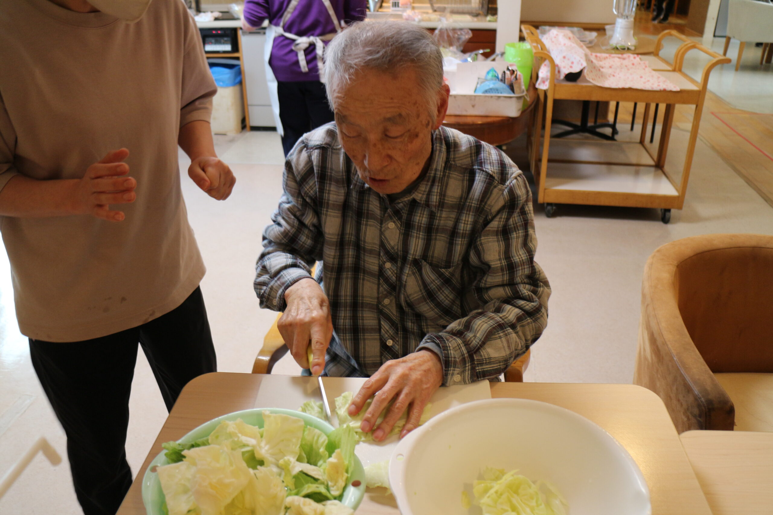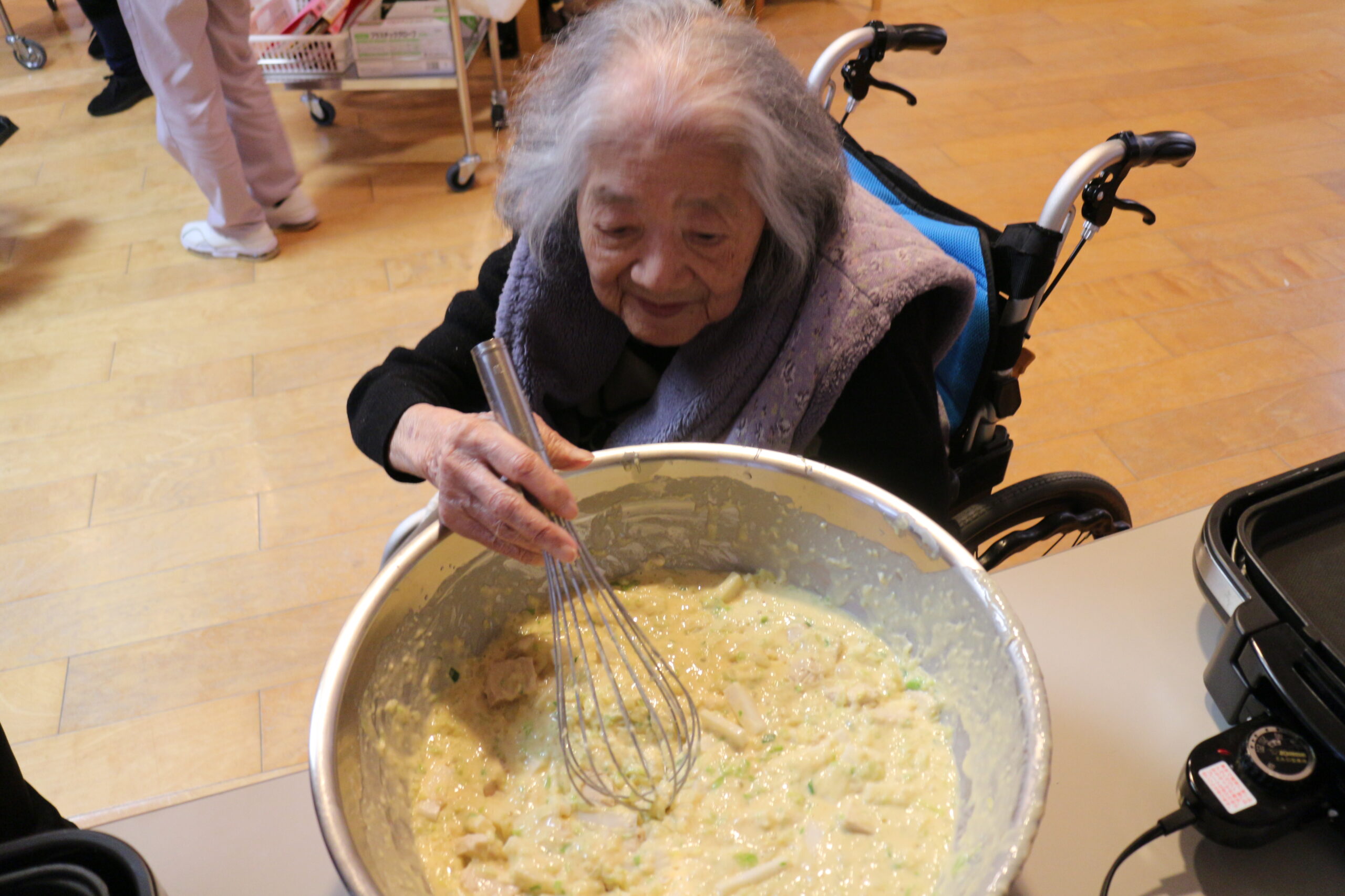 新しくご入居されたお客様が大阪ご出身ということで、「お好み焼き作り」の調理レクリエーションを行いました。