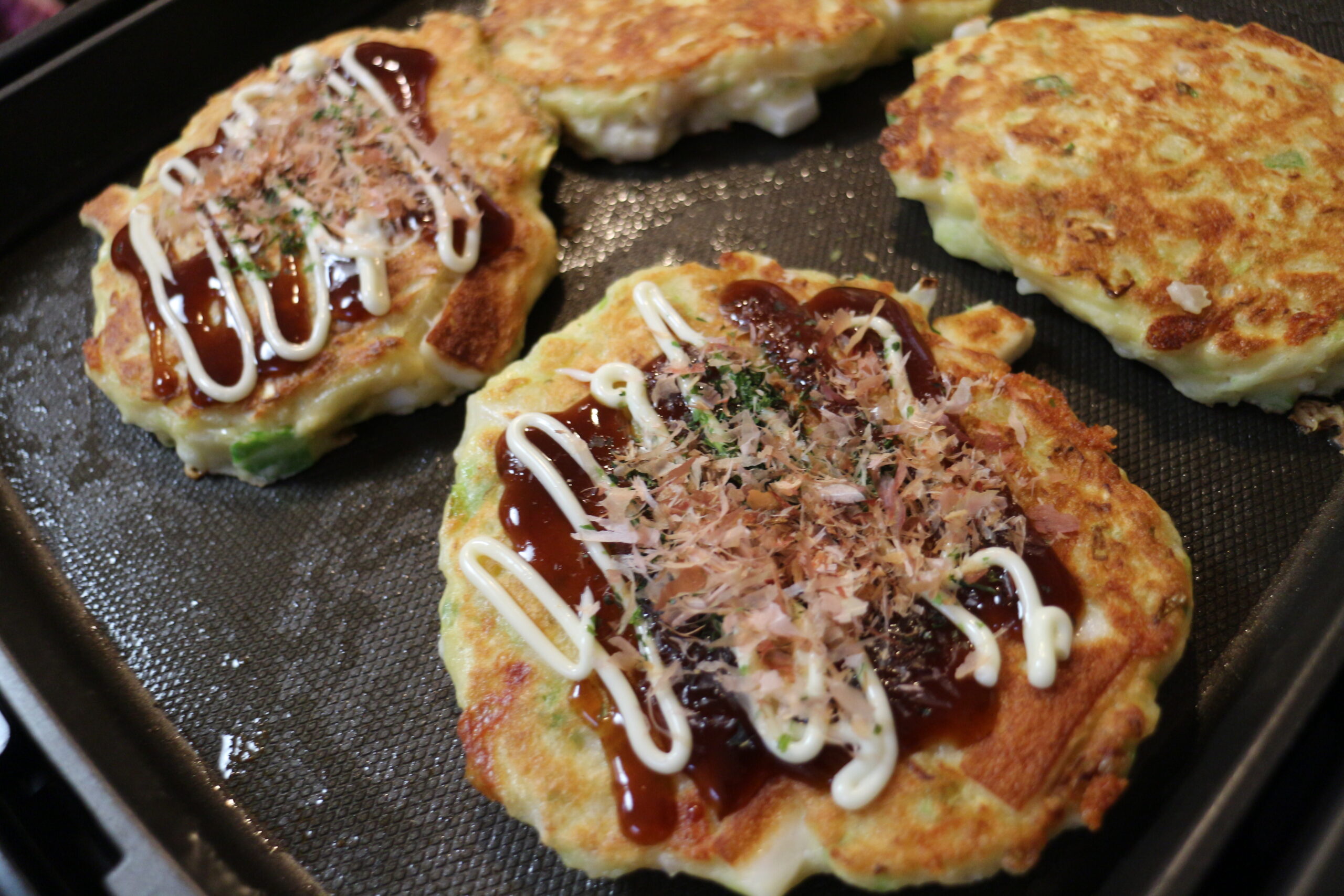 焼き上がったお好み焼きは、あつあつで香ばしく、とても美味しそうな仕上がりに。