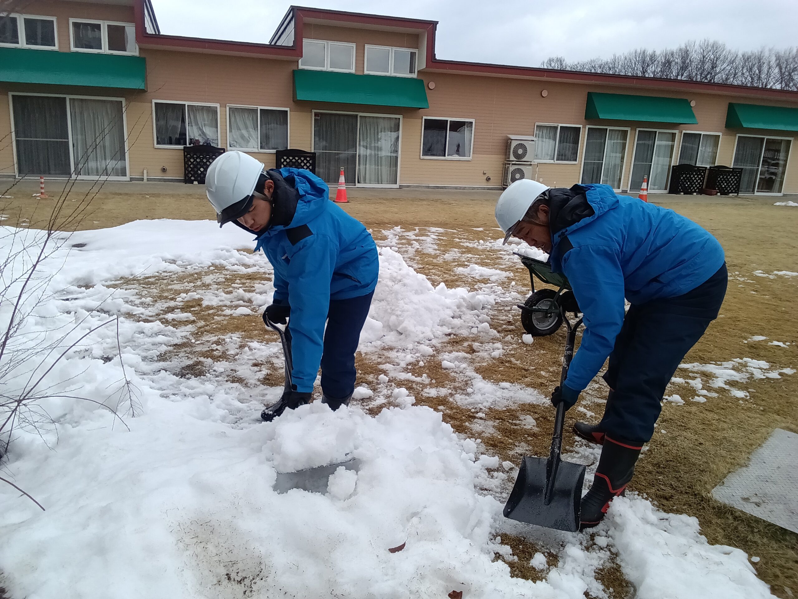 冬の屋外作業の日。朝から気温が低く、地面にはしっかりと雪が残っていましたが、青い防寒ジャケットを着込み、ヘルメットを装着し、しっかり準備を整えて作業をスタートしました。