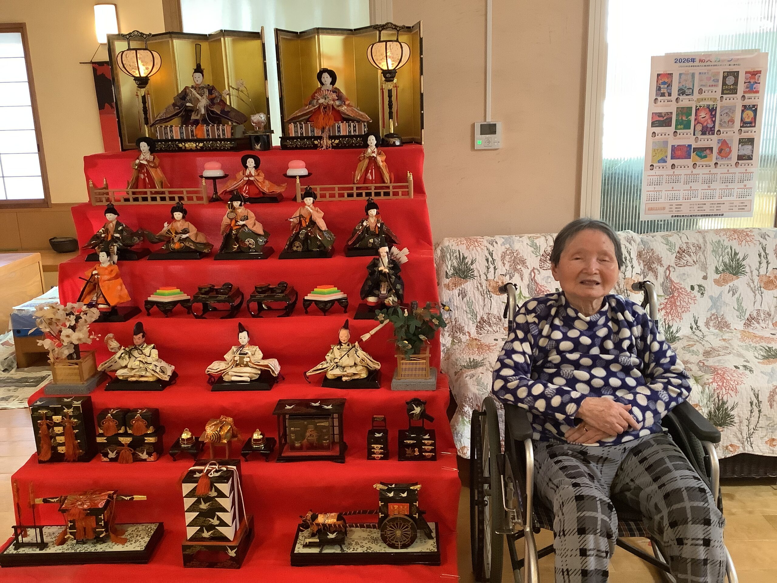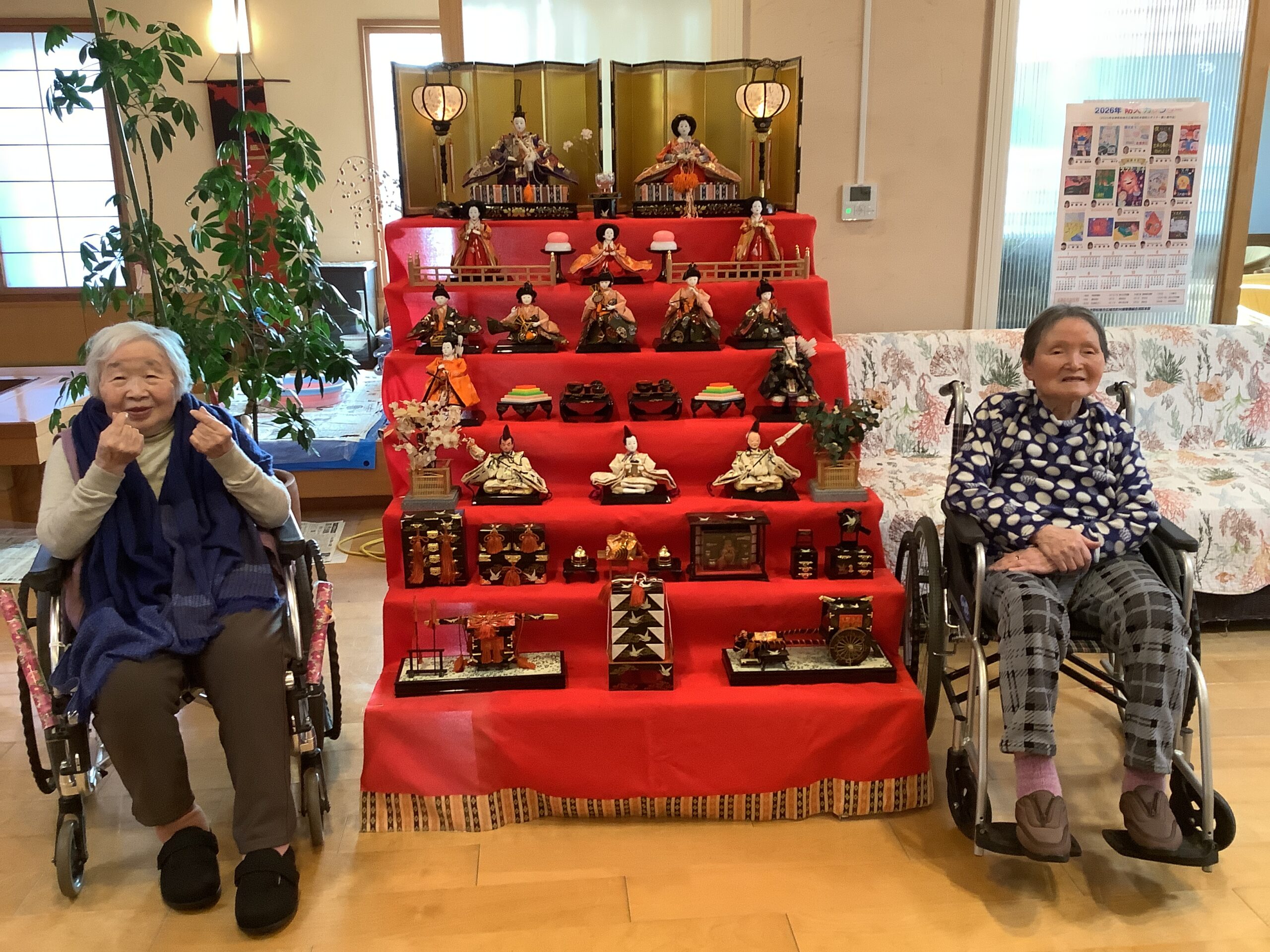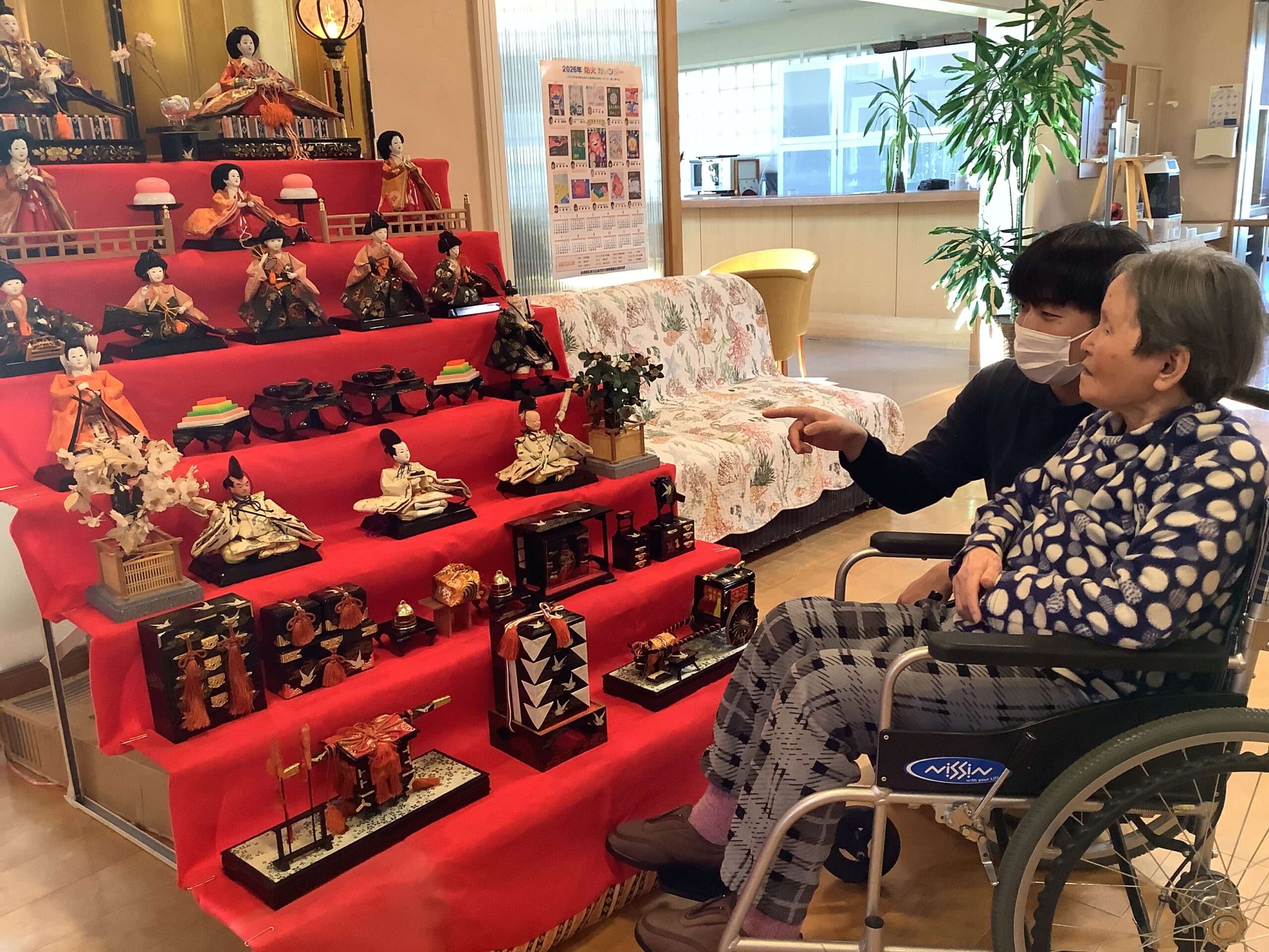 ハーモニーハウスでも、ひと足早く春を感じていただけるよう、ひな人形を飾りました。