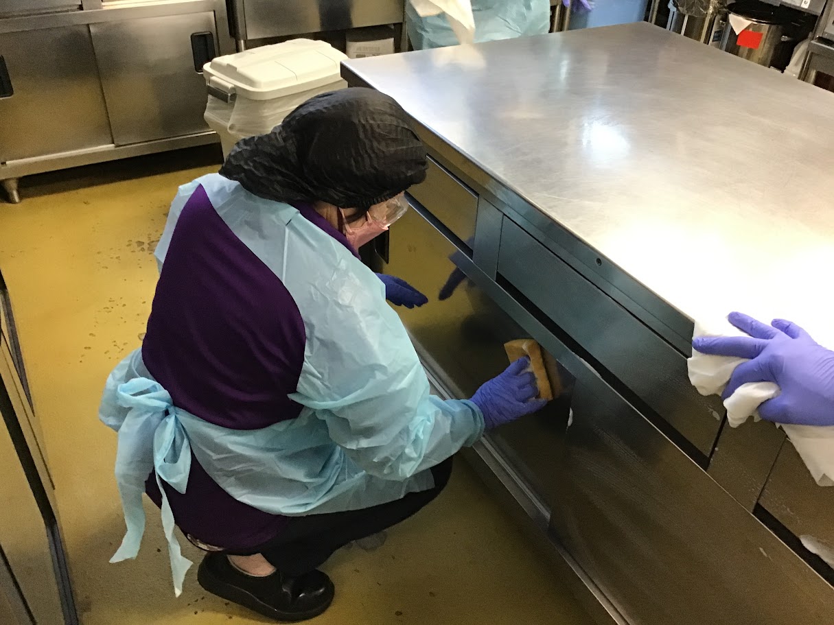 午後は厨房内の消毒作業を行いました。防護服を着用し、次亜塩素酸ナトリウムを使用して、設備や備品を