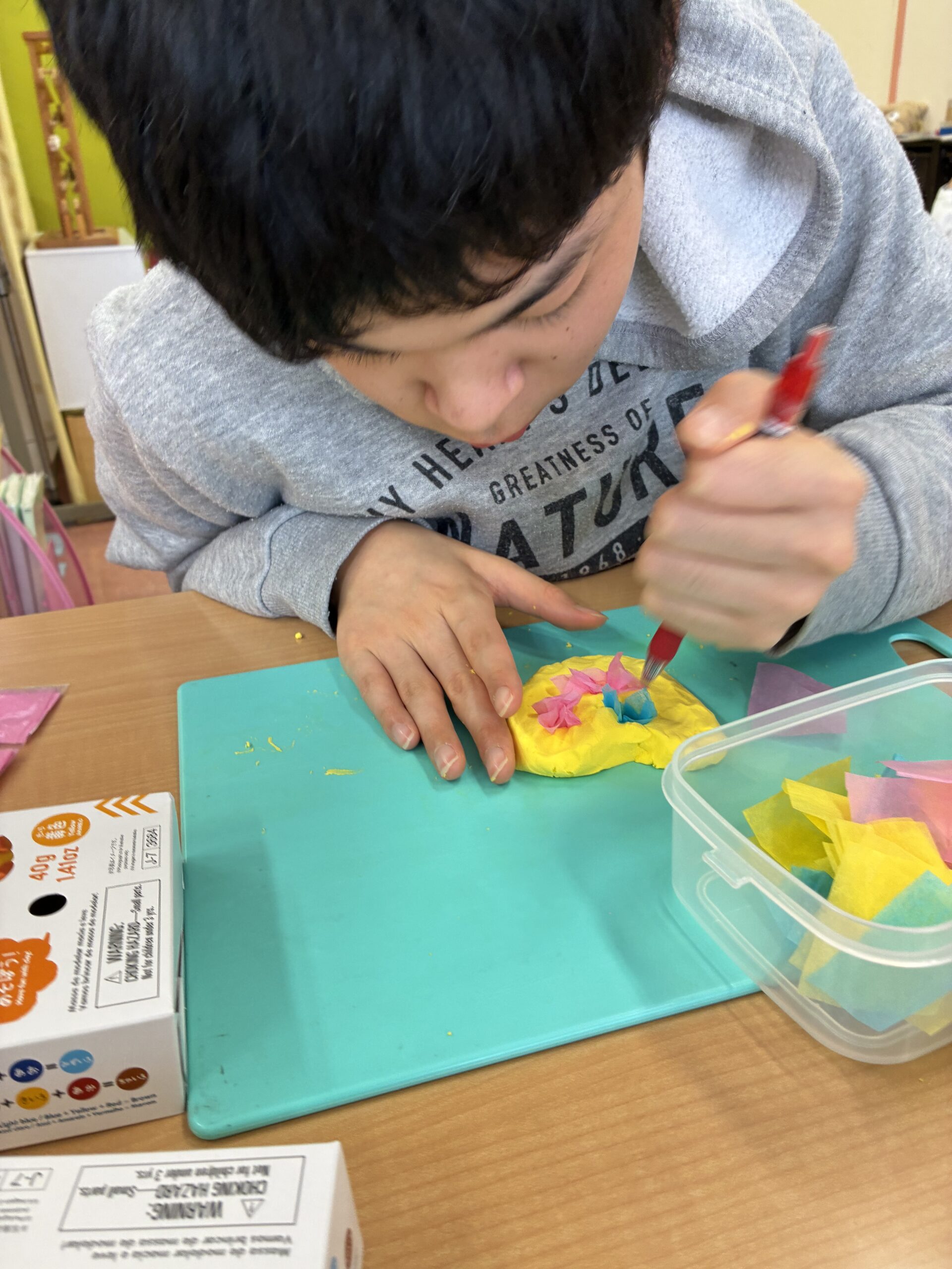 ハート型にした紙粘土にブーケのようなイメージで花紙をたくさんしてもらいました!