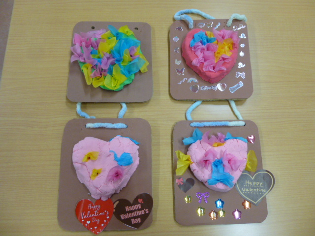 製作では、バレンタインの贈り物としてブーケ風の壁飾りを作りました😊