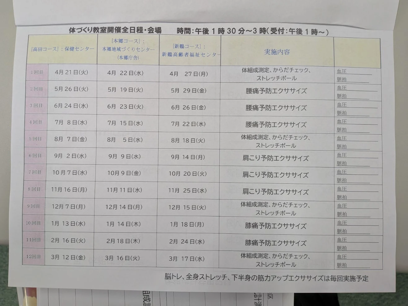 高田、本郷、新鶴とそれぞれの会場で毎月1回、3月まで開催されます。今年度はインストラクターの先生がいろいろな体操を指導してくれます。ぜひご参加ください。